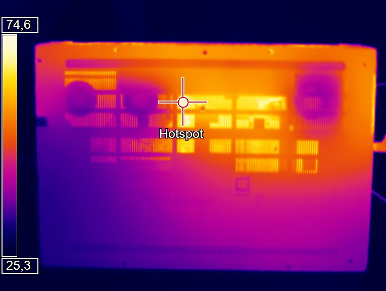 (-) Auf der Unterseite messen wir eine maximalen Wert von 65 °C (im Vergleich zum Durchschnitt von 43.3 °C).