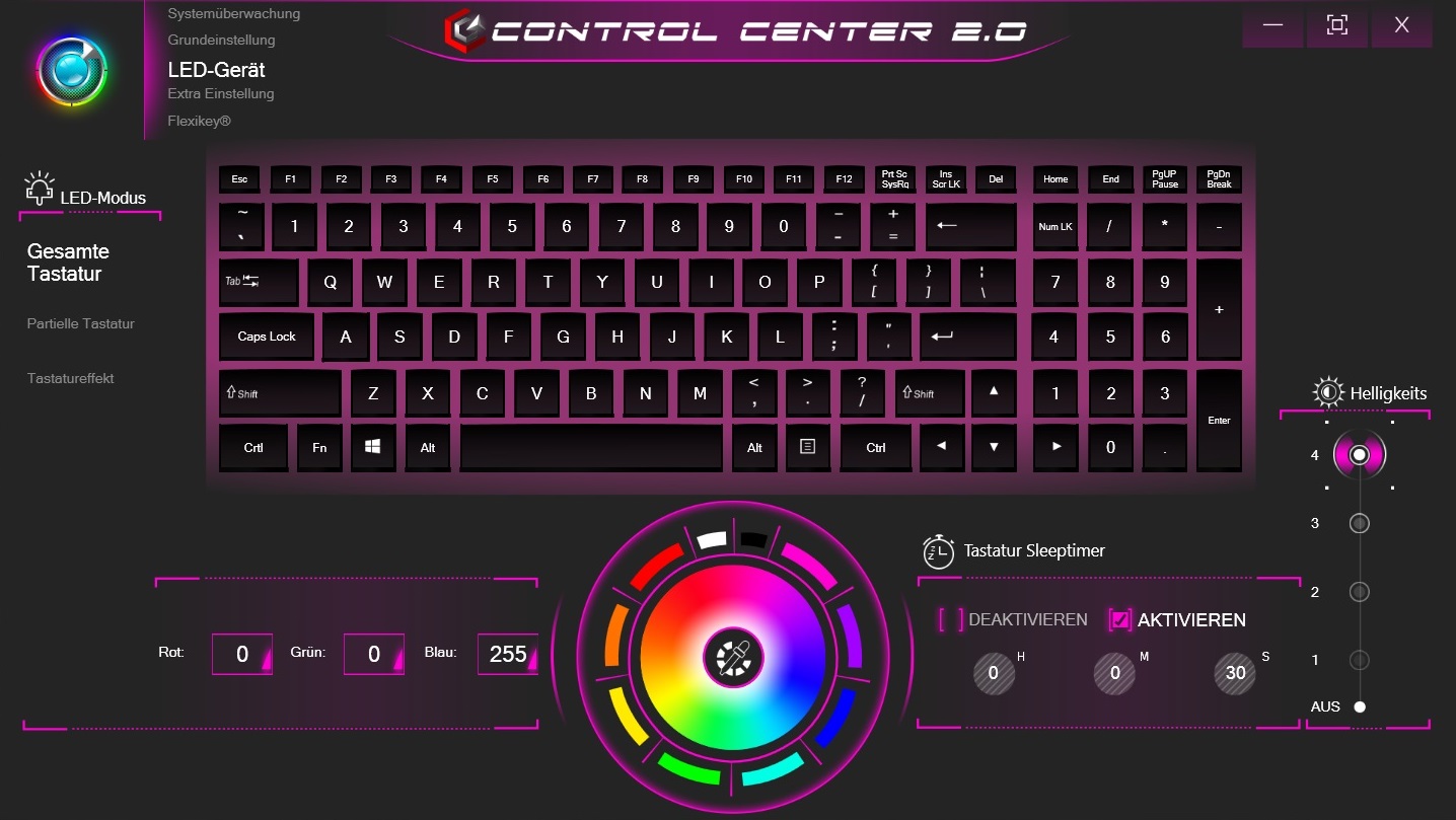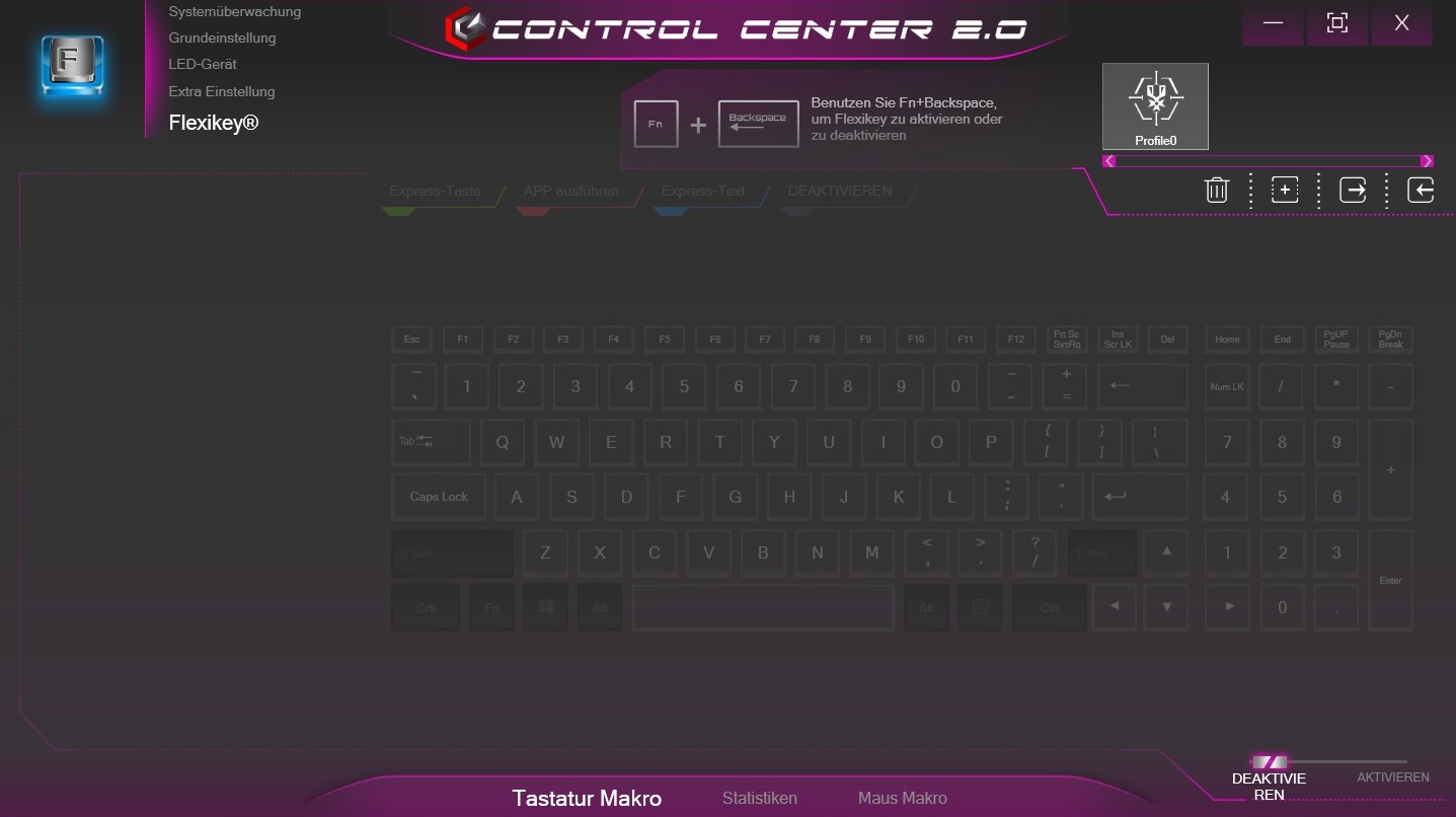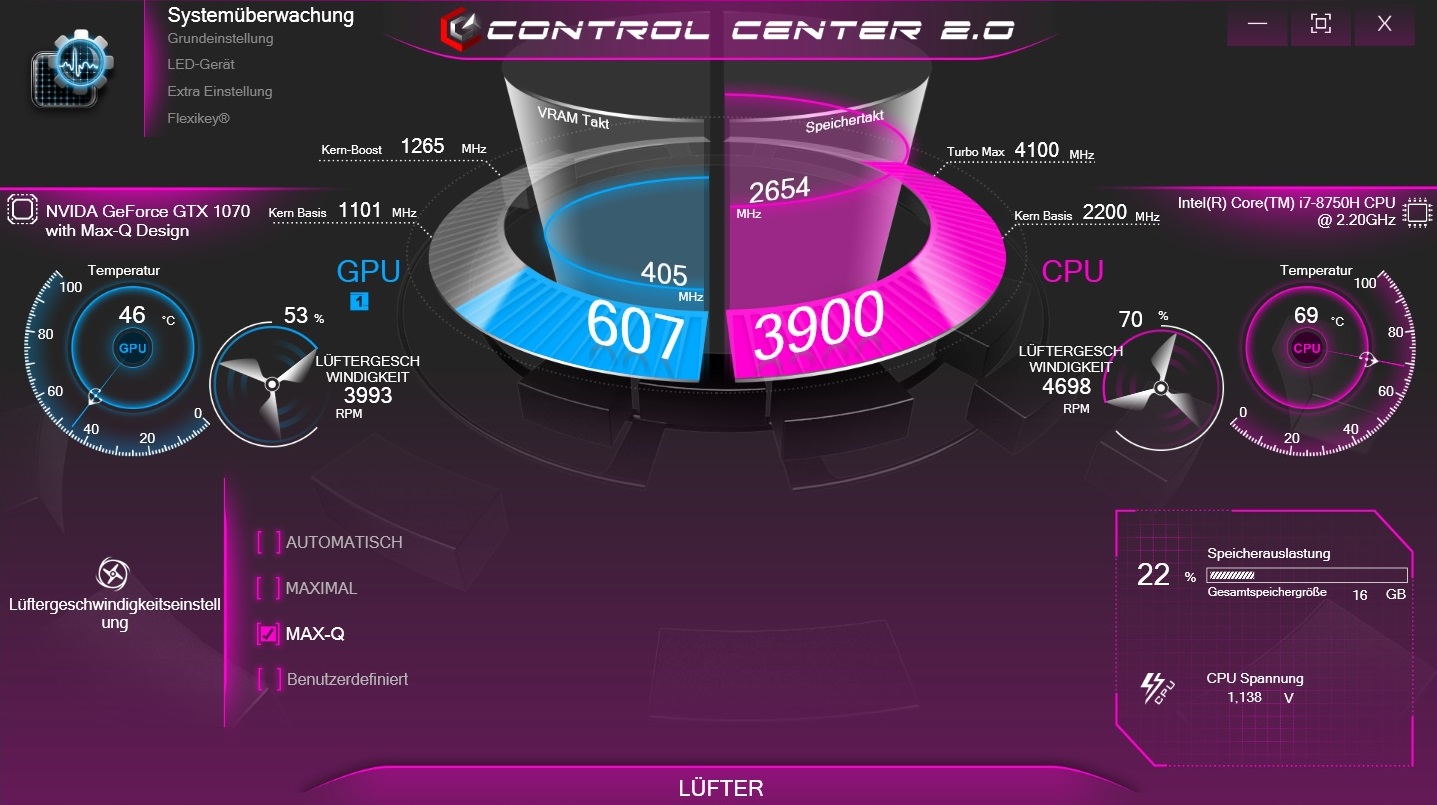 Vor der Performance-Analyse noch ein paar Hinweise zur Software. Barebone-Hersteller Clevo hat das vom Vorgänger bekannte Control Center deutlich umgestaltet und mit neuen Features/Funktionen versehen. Neben der Lüfterdrehzahl werden im Hauptreiter „Systemüberwachung“ auch die Temperaturen bzw. Taktraten von CPU und GPU angezeigt. Bei der Lüftergeschwindigkeit stehen mehrere Modi zur Verfügung. Unsere Tests basieren auf dem standardmäßig aktiven Setting „Max-Q“.