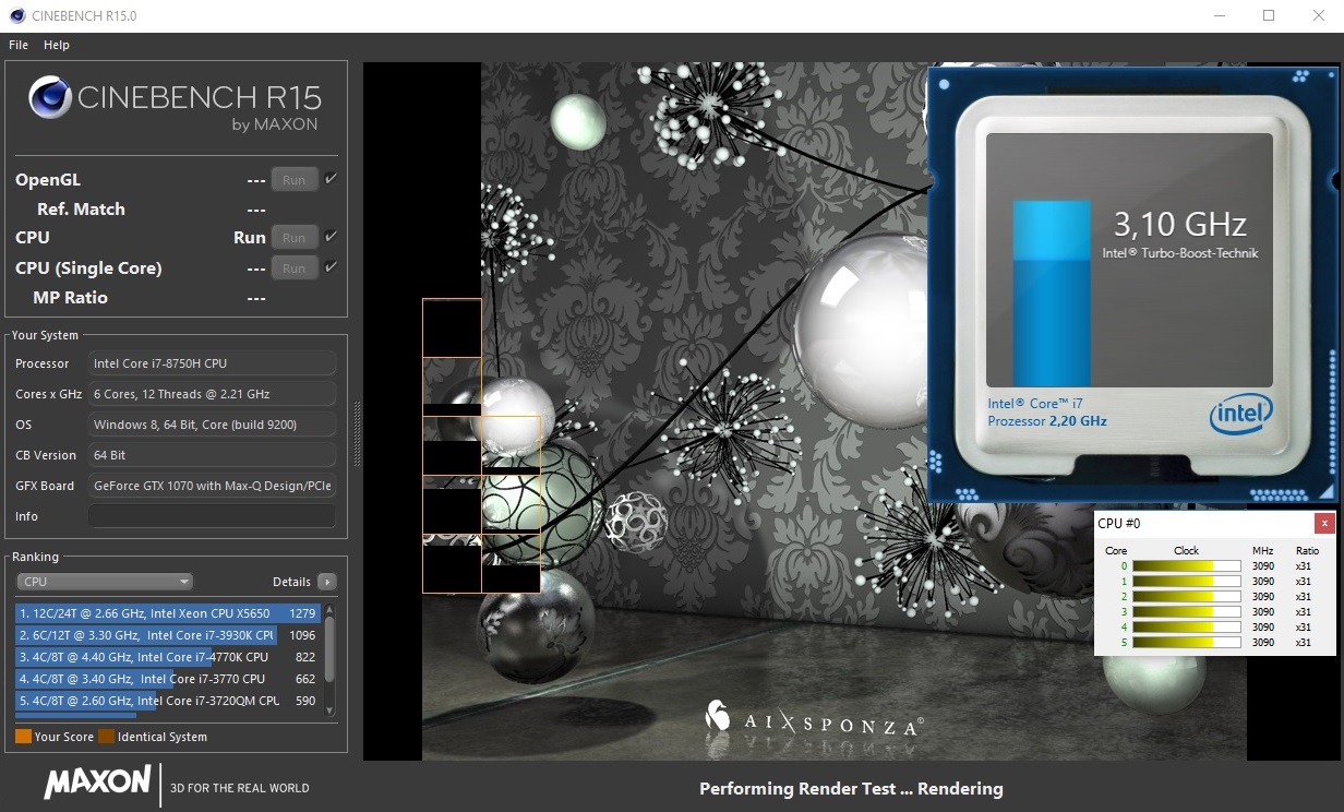 Solange man Geschwindigkeitsmessungen ohne vorherige Belastung durchführt, orientieren sich die Benchmark-Ergebnisse des Key 15 an der Konkurrenz. Beim Multi-Core-Test des Cinebench R15 macht es sich der 15-Zöller zwischen dem etwas flotteren Gigabyte Aero 15X v8 und dem etwas lahmeren MSI GS65 8RF bequem.