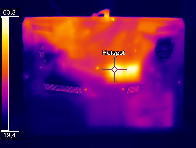 (-) Auf der Unterseite messen wir eine maximalen Wert von 50.8 °C (im Vergleich zum Durchschnitt von 43.3 °C).