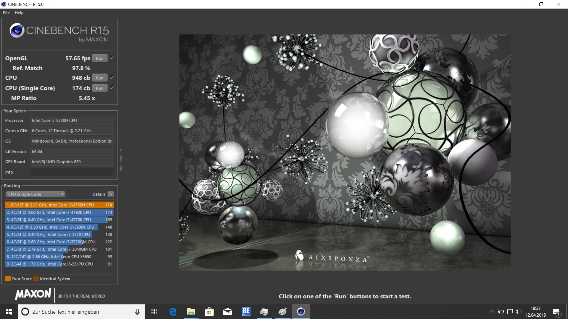 Der Intel Core i7-8750H ist ein 6-Kern-Prozessor mit einer TDP von bis zu 45 Watt und einem Basistakt von 2,2 GHz. Im Turbo kann dieser mit bis zu 4,1 GHz (Ein- und Zweikern Turbo) getaktet werden, wenngleich der All-Core-Boost bei 3,9 GHz liegt. Hier im Vergleich gibt das Schenker Work 15 klar den Ton an, denn alle anderen Vergleichsgeräte sind mit Quad-Core-Prozessoren ausgestattet. Aber auch im Single-Core-Test kann sich das Work 15 vor dem Lenovo ThinkPad T580 platzieren, obwohl dieser mit dem Intel Core i7-8650U ein SoC besitzt, welcher noch einmal 100 MHz höher takten könnte.