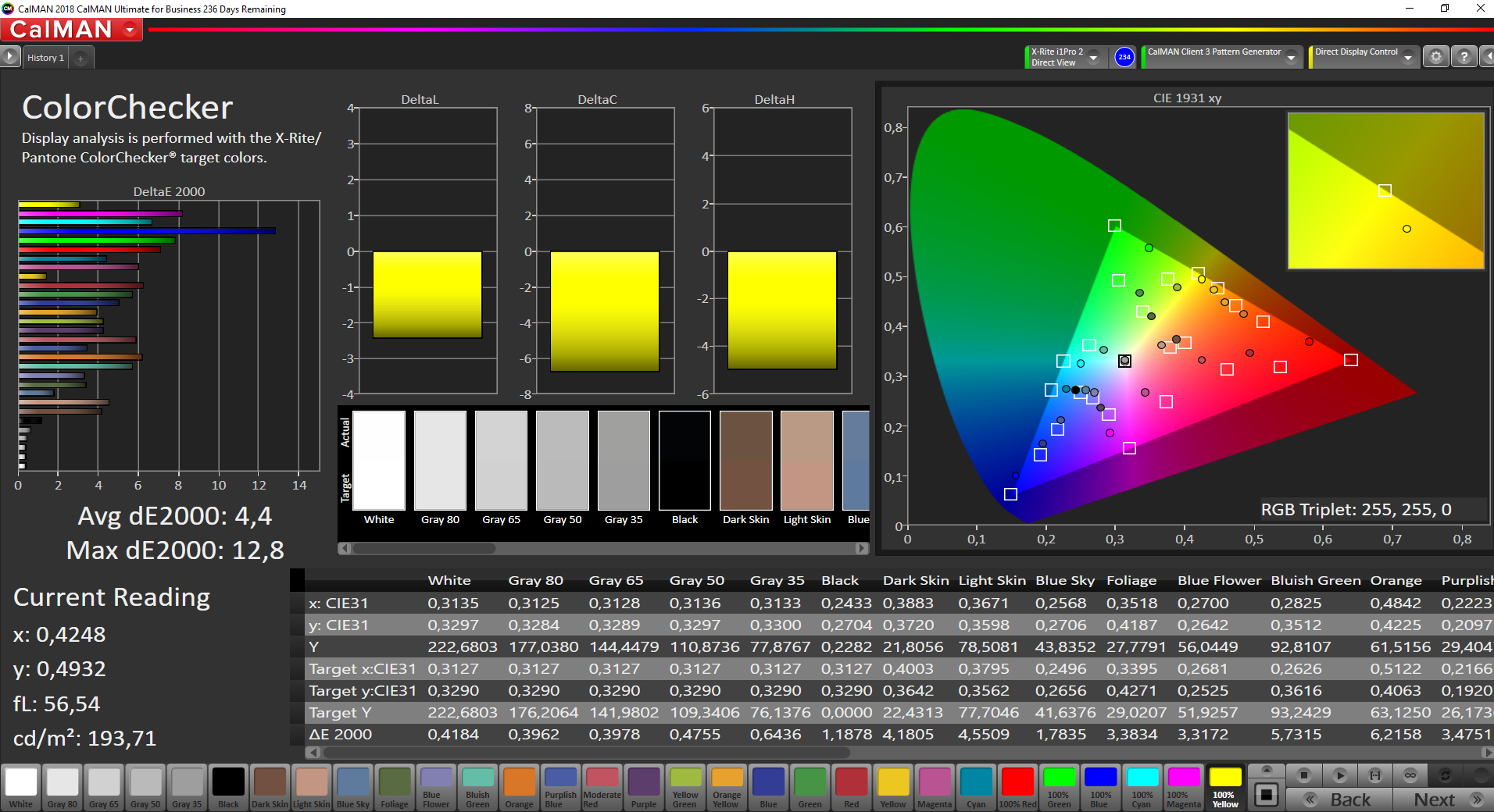 | Delta E Graustufen * | 5.2 | 2.7 48% | 3.3 37% | 3.49 33% | 5.2 -0% |