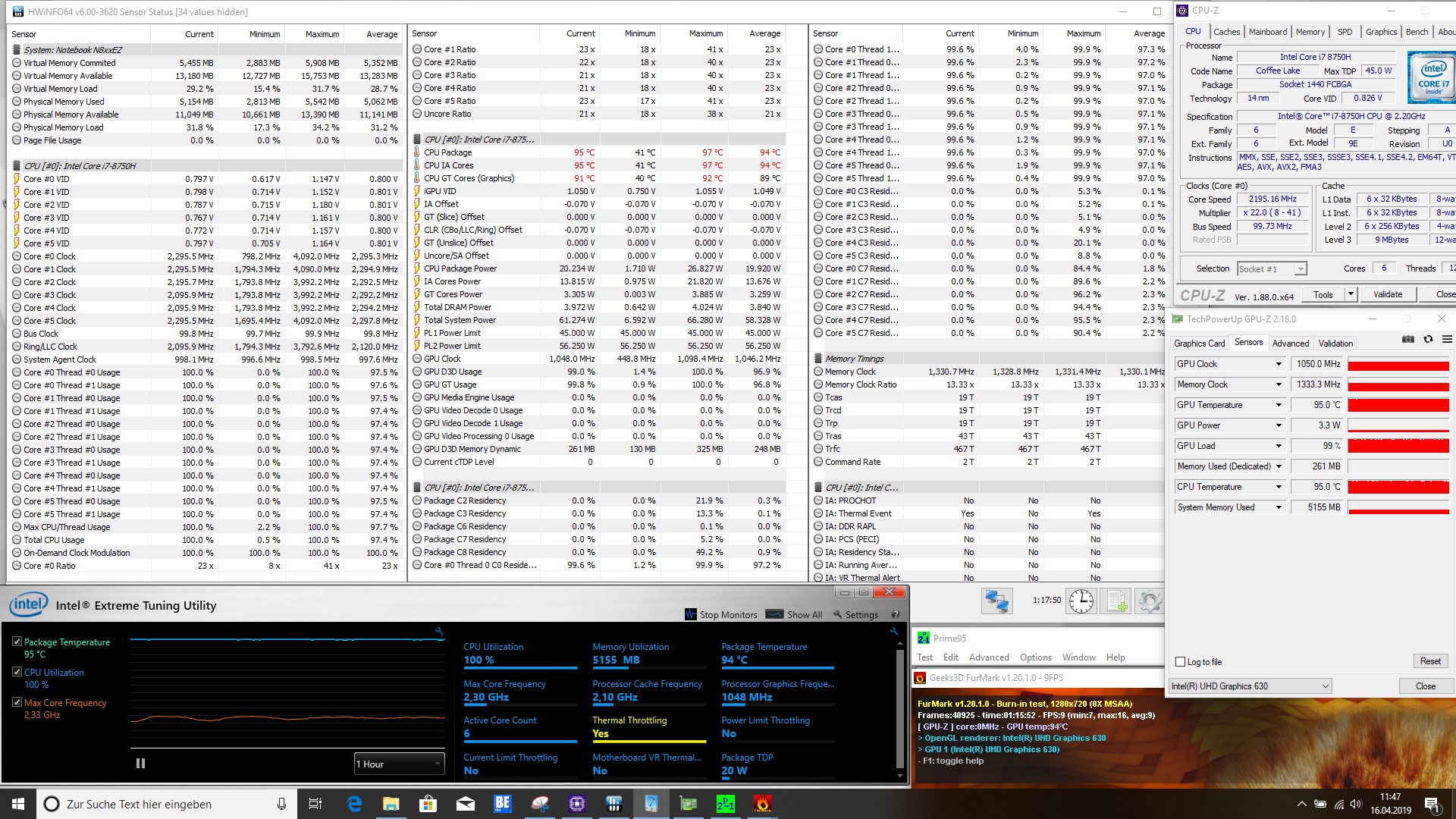 Bei der Intel UHD Graphics 630 messen wir mit 95 °C ähnlich hohe Temperaturen. Gleichwohl kann auch hier nicht der maximale Takt von 1.100 MHz aufrechterhalten werden. Mit durchweg 1.050 MHz taktet die integrierte Grafikeinheit aber nur minimal langsamer. Beim anschließenden Benchmark war das Ergebnis fast auf gleichem Niveau, wie im Vergleich zum Kaltstart.