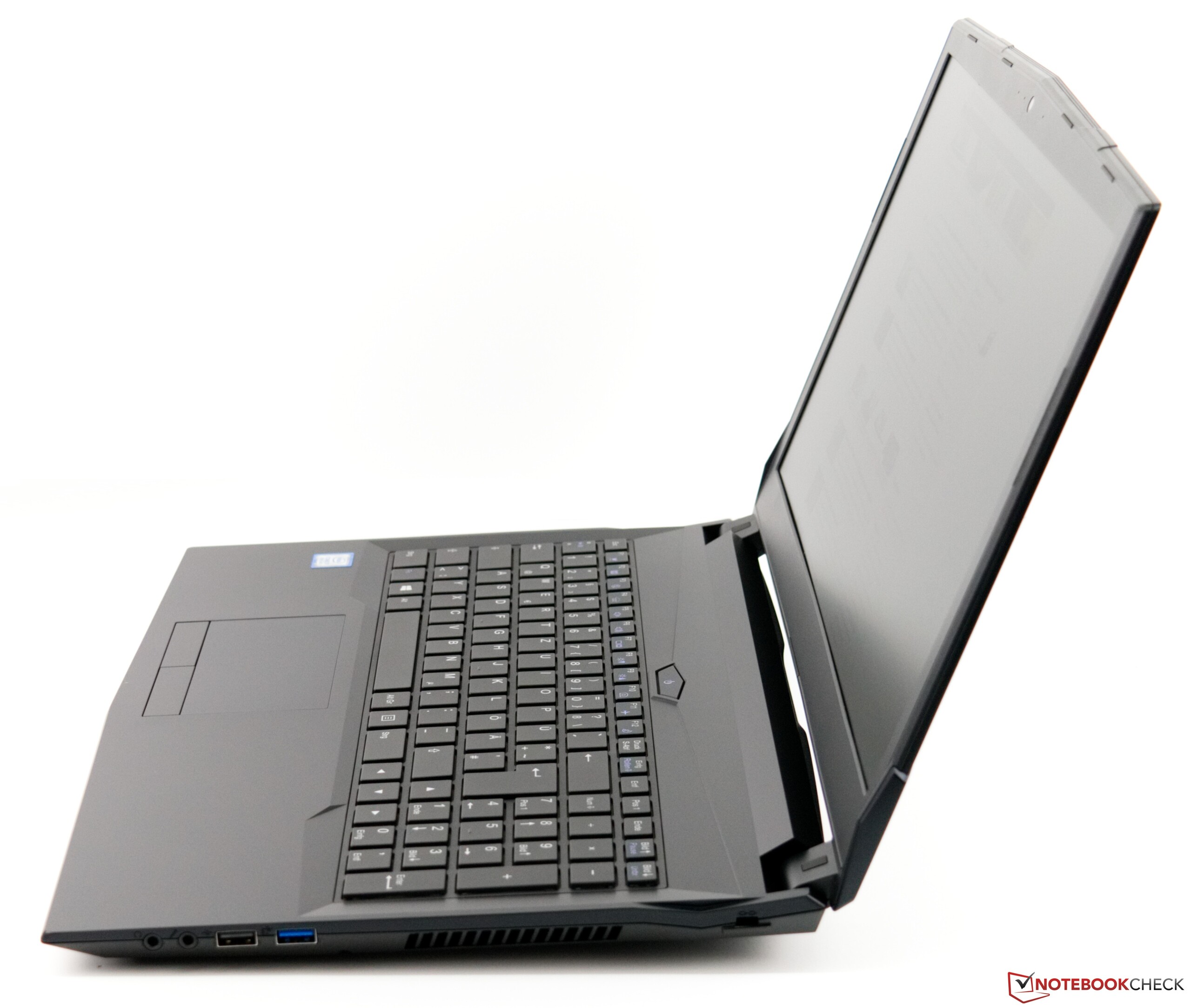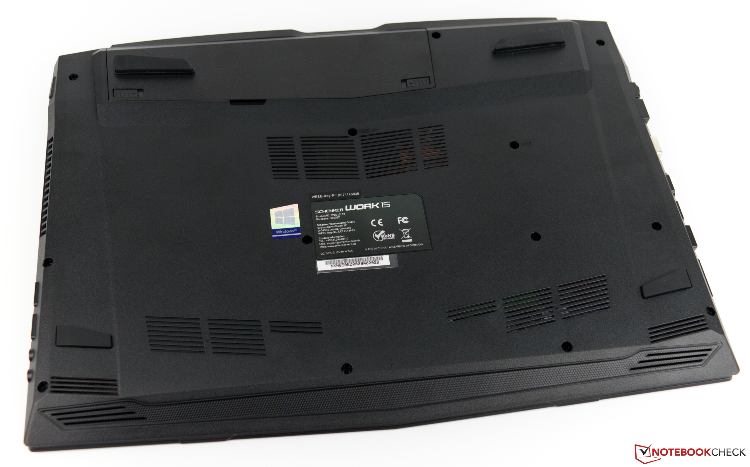 Das Schenker Work 15 kommt im schlichtem Schwarz daher und bietet auch keine farblichen Akzente, welche das Gerät optisch aufwerten würden. Die Materialauswahl wirkt etwas billig, was aufgrund des hohen Kunststoffanteils keine Verwunderung ist. Beim Verwindungstest erweist sich die Konstruktion der Base allerdings recht gut, wenngleich ein leichtes Verdrehen trotzdem möglich ist. Den Drucktest kann die Base leider nur mit einem Befriedigend abschließen, denn mittig ist ein Nachgeben erkennbar. Außerdem ist bei unserem Testgerät neben dem Power-On-Taster ein deutliches Knacken hörbar, sobald dieser Bereich punktuell belastet wird.