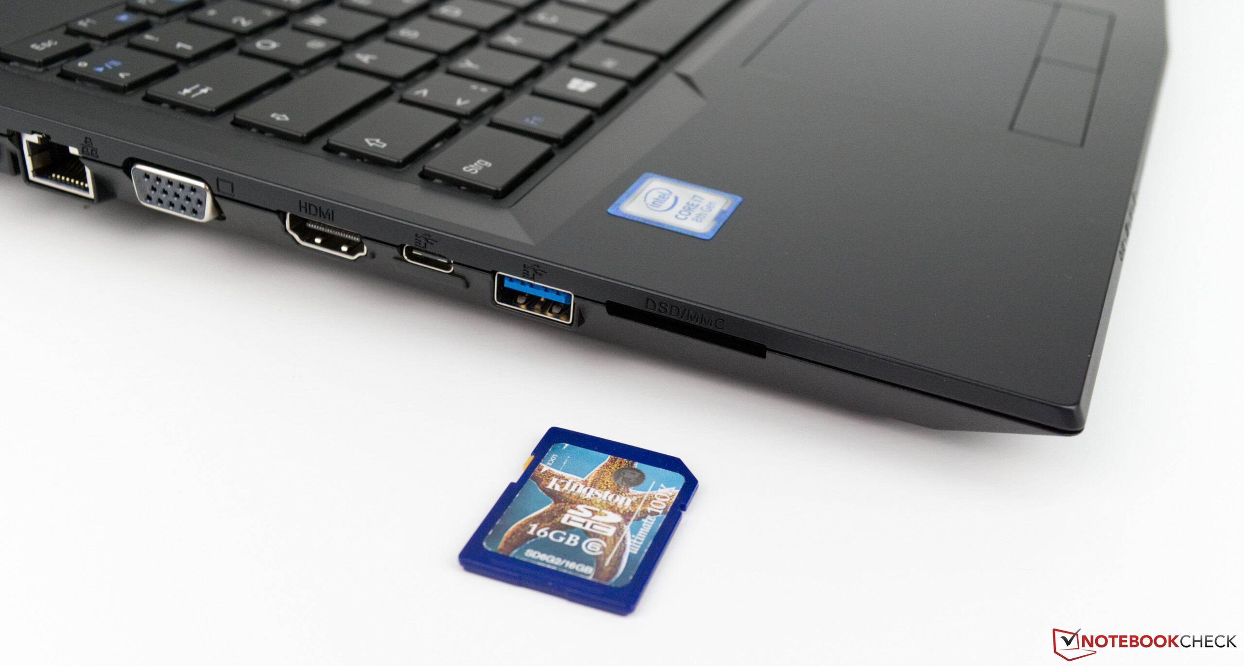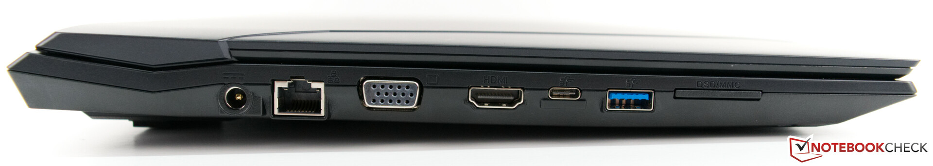 Mit 2,2 Kilogramm ist das Schenker Work 15 das schwerste Gerät hier im Vergleich und auch bei der Stellfläche gönnt sich das Office-Gerät mehr als die Konkurrenz. Alle externen Schnittstellen finden sich auf der linken und rechten Seite wieder, wenngleich die meisten auf der linken Seite platziert wurden. Insgesamt vier USB-Anschlüsse sind gut und sollten für die meisten Anwender im Alltag ausreichen. Dabei sollte jedoch auf den jeweiligen Standard geachtet werden, denn auf der rechten Seite befindet sich ein langsamerer USB-2.0-Anschluss. Der vollwertige SD-Kartenleser ist mit einer Staubschutzkappe versehen und nimmt SD-Karten fast vollständig auf. Die Performance ist ausreichend und im Vergleich recht ordentlich. Gegen den schnellen UHS-II-Kartenleser des Dell Latitude 5590 kann das Schenker Work 15 nicht mithalten.