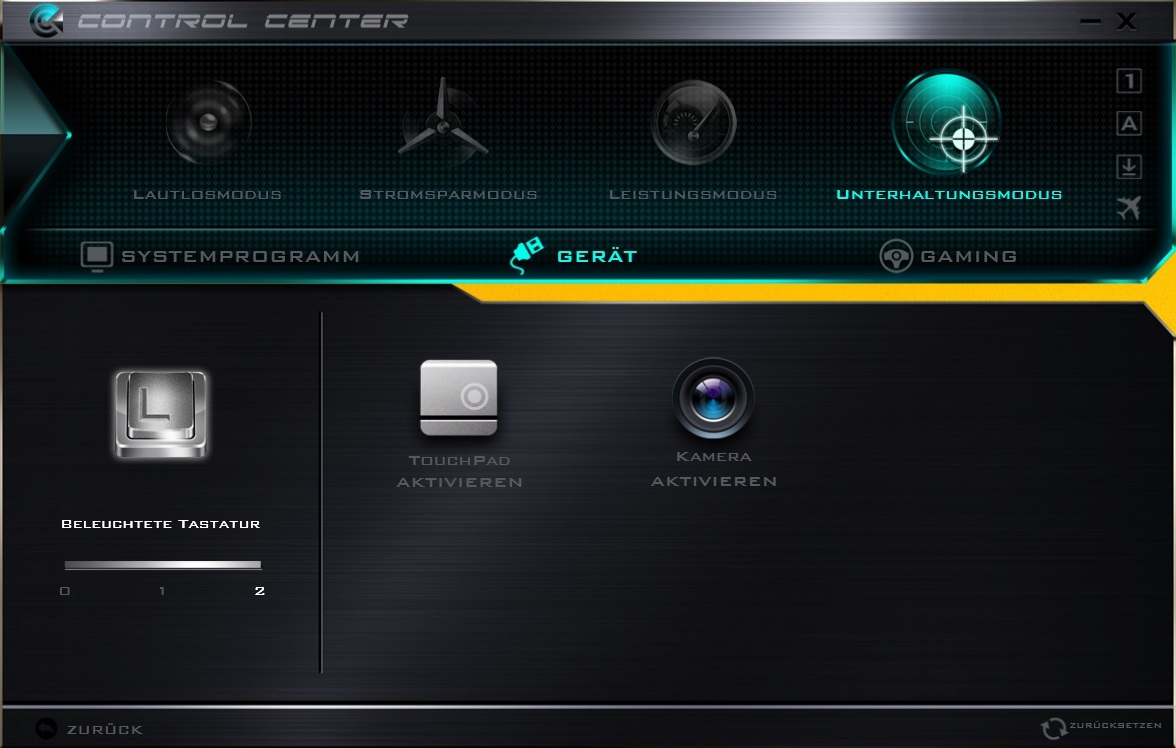 Eine Bloatware-verseuchte Windows Installation müssen Sie bei Schenker nicht befürchten. Wie der rechte Screenshot belegt, konzentriert man sich auf die nötigsten Treiber. Wer keine Lust auf Tastenakrobatik hat, findet zahlreiche Komfort- und Sonderfunktionen in einem Tool namens Control Center. Hier darf man unter anderem das Touchpad und die Tastatur konfigurieren (Beleuchtung, Makros etc.), das Lüfterverhalten ändern oder den Sound und die Displayhelligkeit regeln. Die vier Modi »Lautlos«, »Stromsparen«, »Leistung« und »Unterhaltung« sorgen zu guter Letzt für eine globale Anpassung.