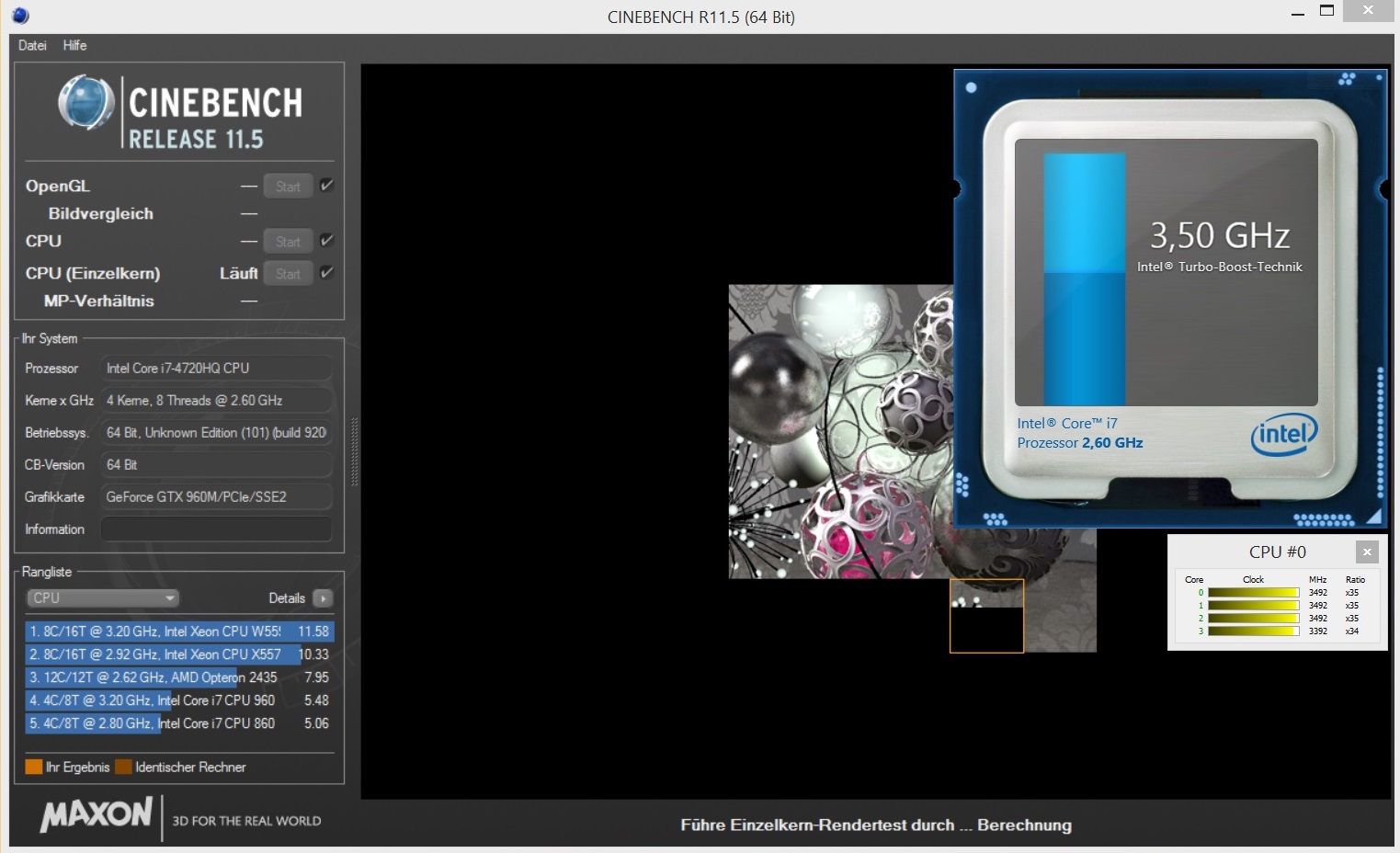 Die Prozessor-Übertaktung hätte uns fast einen Strich durch die Rechnung gemacht. Wie sich im Test mit den Cinebench R11.5 herausstellte, brach der Takt bei Multi-Core-Last innerhalb von ein paar Sekunden auf den Grundwert, also 2,6 GHz ein. Andere Notebooks mit Core i7-4720HQ erreichen hier bis zu 3,4 GHz.