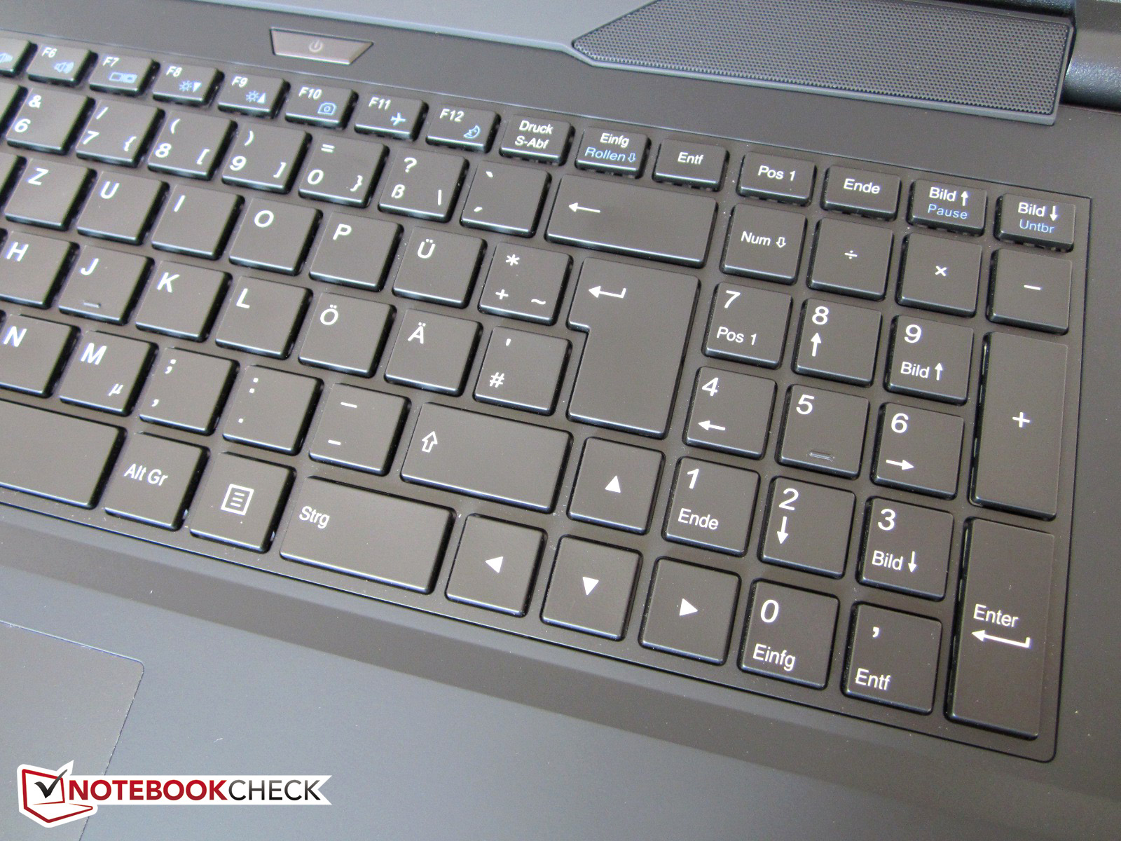 Dafür bekommt der Nutzer einen vierspaltigen Nummernblock und eine weiße, in zwei Stufen regelbare Beleuchtung. Die Tastengröße kann sich – mit Ausnahme der F-Reihe – auch sehen lassen. Knapp 15 x 15 Millimeter sind typisch für ein Notebook. Ob man den rot markierten WASD-Bereich zu schätzen weiß, hängt vom Auge des Betrachters ab. Insgesamt ergattert das Keyboard die Note »Gut«. Für eine höhere Wertung müsste die Tippmechanik leiser und die Beleuchtung einen Hauch intensiver sein. Zudem würde sich der Autor über abgerundete Tasten freuen.
