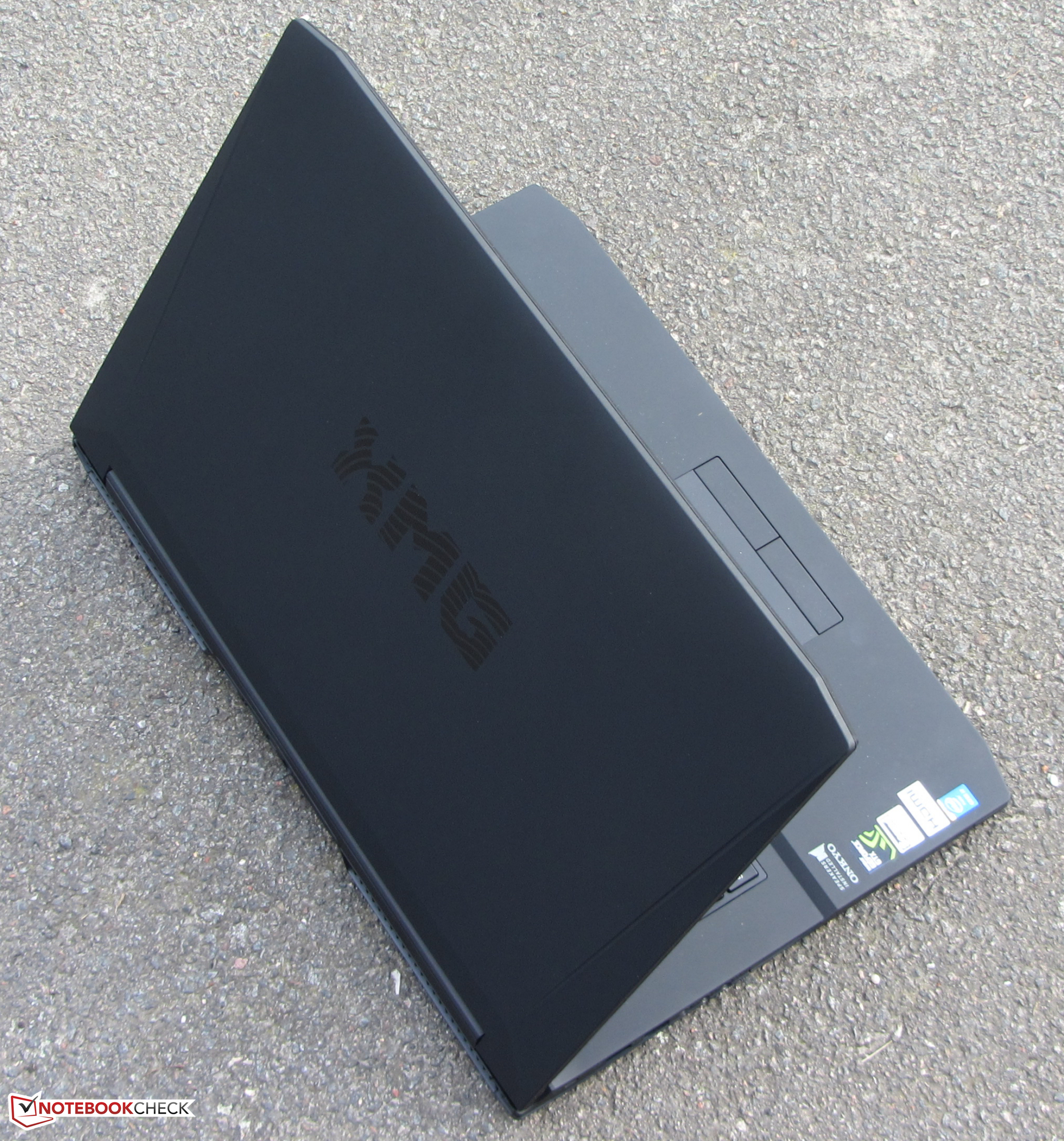 Das Gehäuse des XMG A705 besteht durchgehend aus schwarzem Kunststoff. Oberflächentexturen sind nicht anzutreffen. Die Oberseite der Baseunit und die Deckelrückseite sind gummiert. Die Lautsprecherleiste findet sich oberhalb der Tastatur und ist zum Benutzer hin angewinkelt. Zwischen Lautsprecherleiste und Tastatur wurde ein nicht zu übersehender Power Button platziert. Auf der Unterseite des Geräts trifft man auf zwei einfach zu öffnende Wartungsklappen, die den Zugriff auf die gesamte Hardware ermöglichen.
