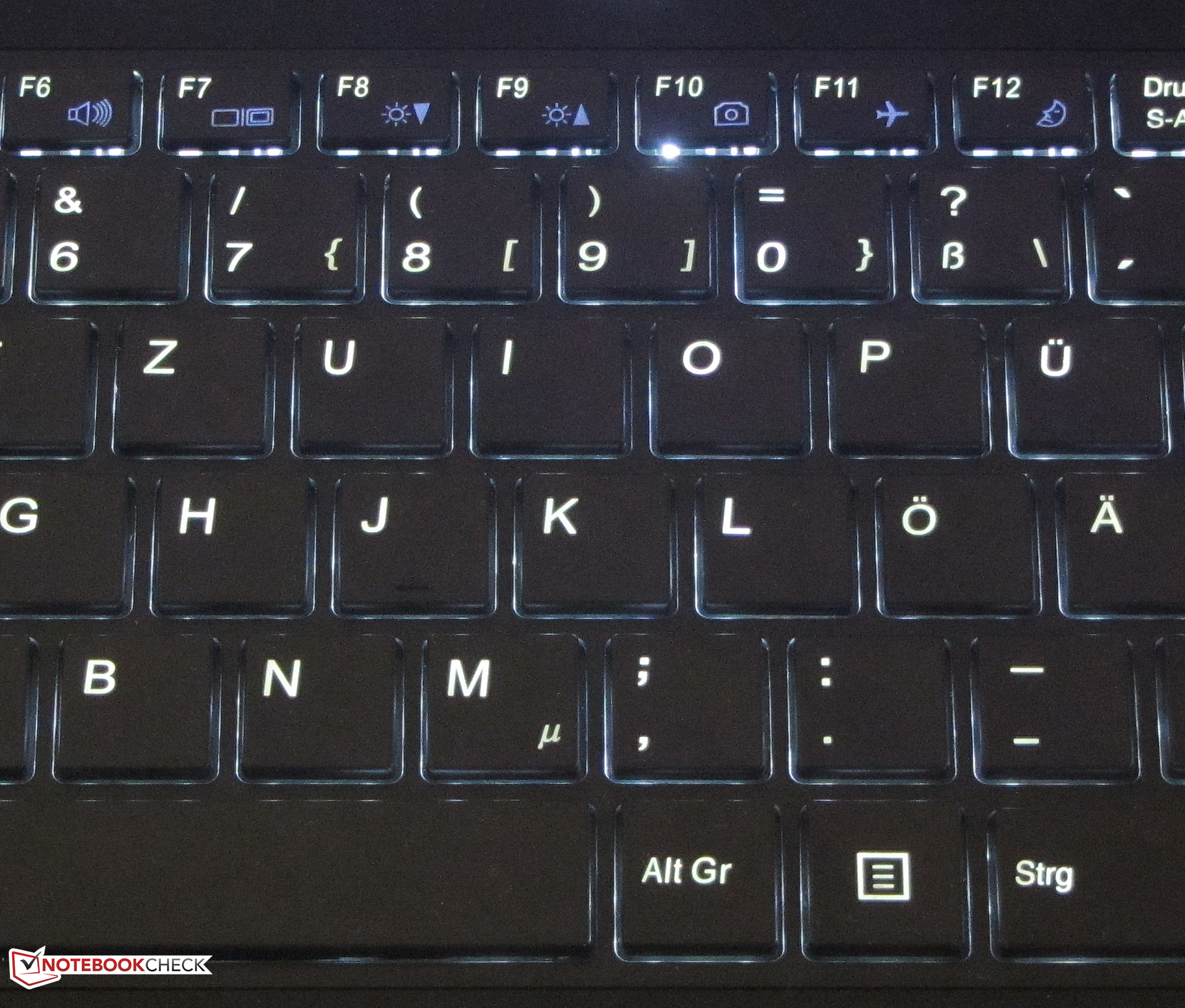 Das Notebook bietet eine Chiclet-Tastatur. Deren Beleuchtung kann in zwei Helligkeitsstufen geregelt werden. Die Haupttasten besitzen eine Größe von etwa 15 x 15 mm. Insgesamt verfügen die Tasten über einen normalen Hub und einen deutlichen Druckpunkt. Uns gefällt ihr knackiger Widerstand. Alles in allem überrascht die Tastatur mit einem guten Schreibgefühl.