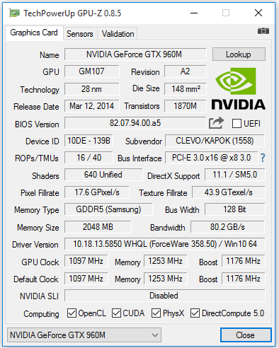 Wie im Schenker XMG A705 steckt auch im XMG A706 der GeForce GTX 960M Grafikkern. Die GPU ist dem unteren Ende der GPU-Oberklasse zuzuordnen. Sie unterstützt DirectX 11 und arbeitet mit einer Basisgeschwindigkeit von 1.097 MHz. Mittels Turbo kann die Geschwindigkeit auf 1.176 MHz erhöht werden. Der GPU stehen 2.048 MByte GDDR5-Speicher (128-Bit-Anbindung) zur Seite. Alles in allem bewegen sich die 3D-Mark-Resultate des Rechners auf einem normalen Niveau für die hier verbaute GPU.