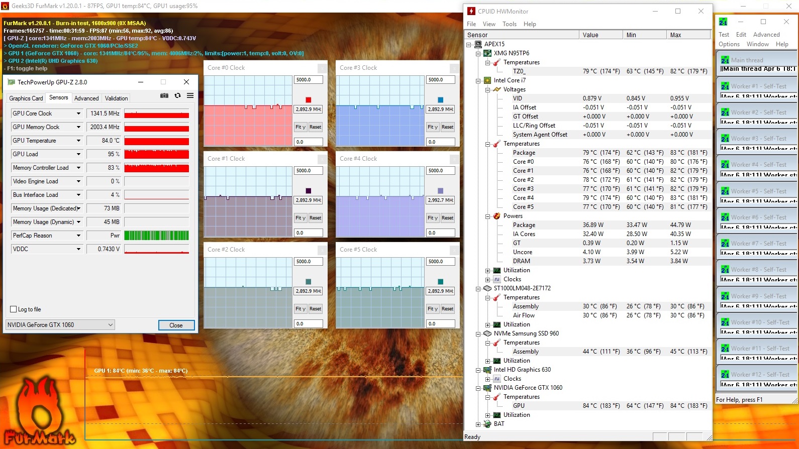 Während unseres Stresstests mit Prime95 + FurMark pendelten sich die CPU-Kerntakte bei 2,9 bis 3 GHz und der GPU-Takt bei rund 1.340 MHz ein, in diesem praxisfernen Szenario kommt es also zu mäßigem Throttling. Der Prozessor erreichte dabei maximal 83 °C und die Grafikkarte bis zu 84 °C.
