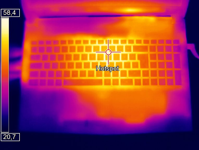 Wer tatsächlich mit einen 2,8 kg schweren Gaming-Laptop auf dem Schoß 3D-Spiele zocken will, muss sich auf leicht unangenehme Temperaturen von bis zu 49 °C an der Unterseite einstellen. Normalerweise stehen solche Geräte aber auf dem Tisch, wo es mehr auf die Temperaturen der Handballenablage ankommt. Und die erreichen im Extremfall bis zu 43 °C - ein suboptimaler Wert. Bei geringer Last bzw. im Idle sind die Temperaturen hingegen kein Thema.