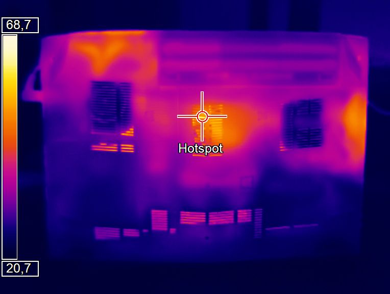 (+) Ohne Last messen wir eine durchschnittliche Temperatur von 25.6 °C auf der Oberseite. Der Klassendurchschnitt erreicht 33.9 °C.