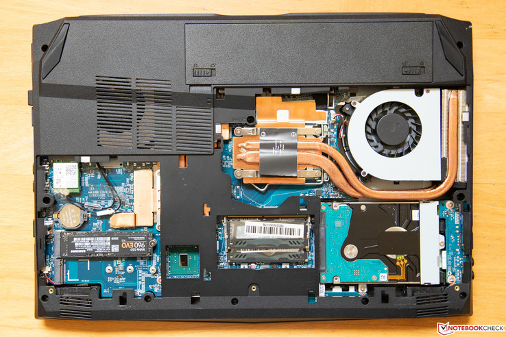 Für Wartungszwecke muss lediglich eine mit 3 Kreuzschrauben gesicherte Bodenplatte entfernt werden. Wenn man erst mal darauf gekommen ist, die Platte nach dem Lösen der Schrauben ein Stück weit nach vorne zu ziehen, erweist sich die in der Regel von Schenker tolerierte Demontage als völlig problemlos. Wie man auf dem Foto unten sehen kann, erhält man Zugang zum CPU-Lüfter, den m.2-Steckplätzen für SSDs (1 frei), den RAM-Bänken (beide belegt) sowie 2,5-Zoll-Festplatte und WLAN-Modul. Der Akku ist von außen entnehmbar - insgesamt vorbildlich!