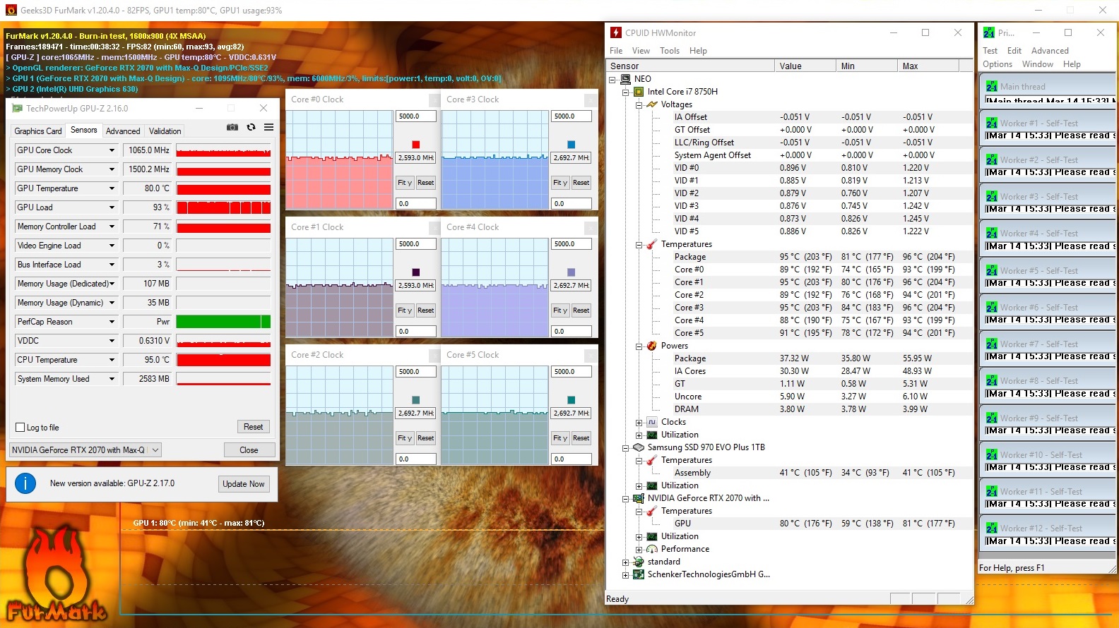 Unseren Stresstest (Prime95 und FurMark laufen für mindestens eine Stunde) absolviert das XMG Neo 15 im Netz- und im Akkubetrieb auf unterschiedliche Weisen. Im Netzbetrieb arbeitet der Prozessor mit 2,6 bis 2,7 GHz, der Grafikkern geht mit 1.065 MHz zu Werke. Im Akkubetrieb liegt der CPU-Takt bei etwa 2,3 GHz, die GPU wird auf ihre Basisgeschwindigkeit (300 MHz) gedrosselt.