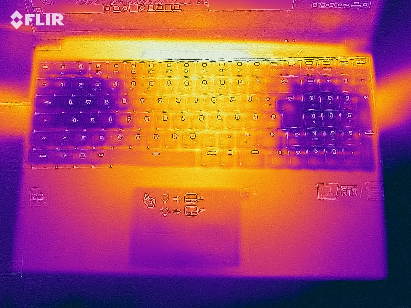 Unter Last erwärmt sich das Notebook stark. Wir registrieren an mehreren Messpunkten Temperaturen jenseits von 60 Grad Celsius. Etwas geringer fällt die Erwärmung bei der Durchführung des Witcher-3-Tests (das Spiel läuft 1 Stunde in Full-HD-Auflösung und maximalen Qualitätseinstellungen) aus, auf den Oberschenkeln kann das Gerät aber auch dann nicht abgestellt werden. Im Idle-Betrieb liegen die Werte im grünen Bereich.