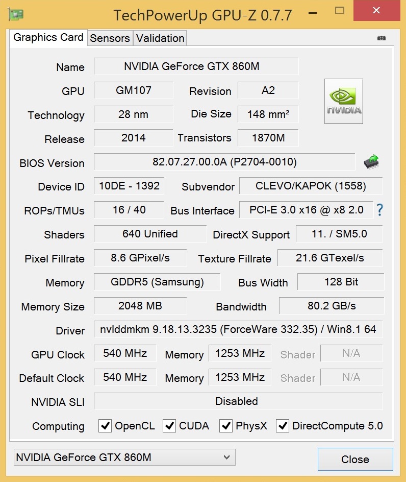 Eine der größten Verbesserungen ist sicherlich die Grafikkarte. Statt der GeForce GTX 765M, welche noch auf der Kepler-Architektur basiert, kommt beim W230SS Barebone die GeForce GTX 860M mit Maxwell-Technik zum Einsatz (GM107-Chip).