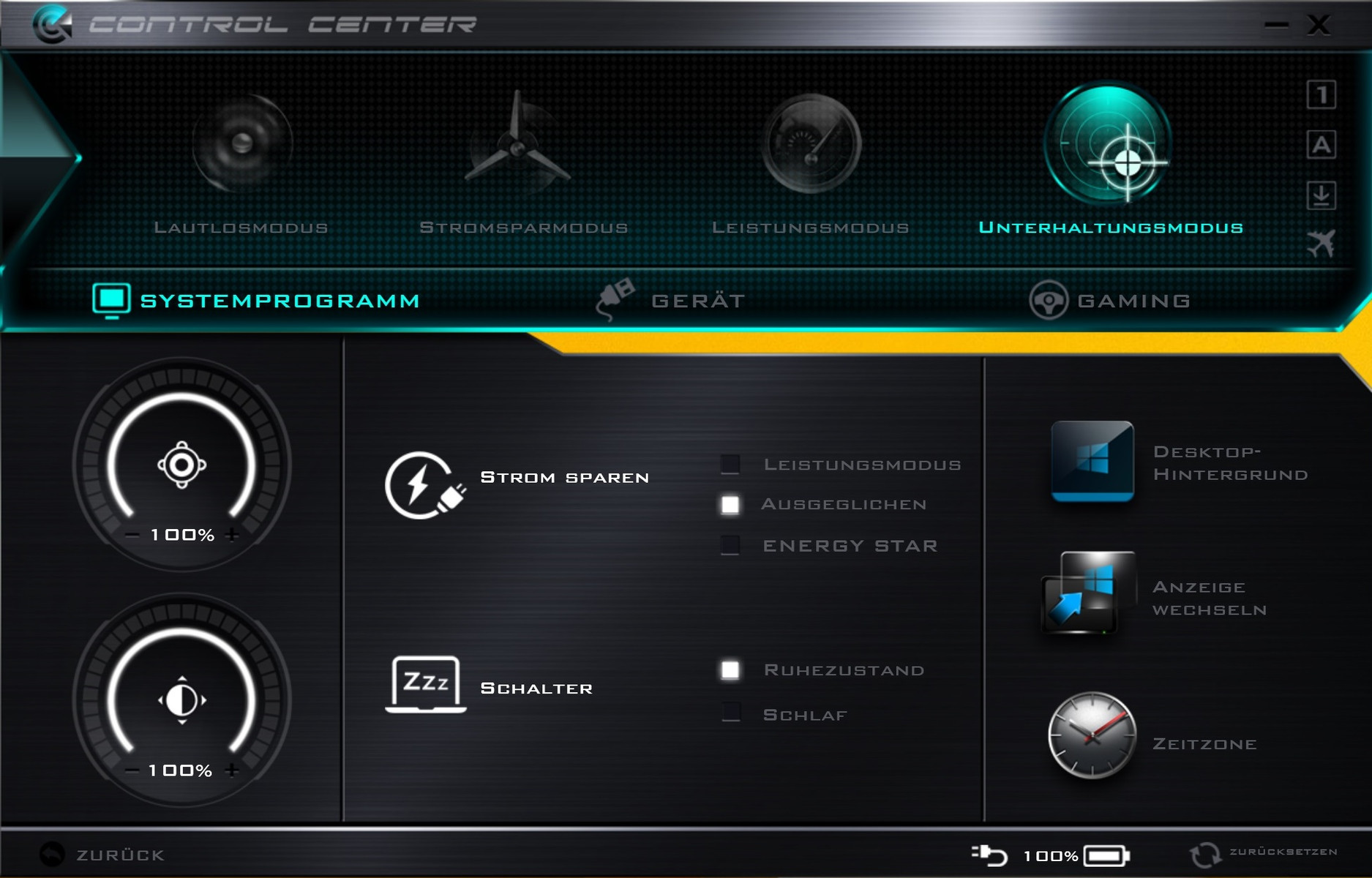 Wie von Schenker gewohnt, ist die Installation aufgeräumt. Nervige Bloatware sucht man ebenso vergebens wie unnötige Hersteller-Tools. Clevo beschränkt sich auf ein Programm namens Control Center, das eine Anpassung der Betriebsmodi »Lautlos«, »Stromsparen«, »Leistung« und »Unterhaltung« ermöglicht. In den drei vorhandenen Reitern werden zum Beispiel die Displayhelligkeit und der Kopfhörersound geregelt.