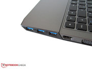 Trotz einiger Unstimmigkeiten (dazu gleich mehr) ist die Anschlussausstattung ordentlich. So verpasst Clevo dem W230SS Barebone ganze vier USB-Ports, von denen drei den flotten 3.0-Standard beherrschen. Externe Monitore wandern an den analogen VGA- oder den digitalen HDMI-Port. Sound lässt sich natürlich auch übertragen: Der Kopfhörerausgang kann Headsets oder Boxen ansteuern (3,5-mm-Klinke). Ein Kartenleser und ein Anschluss für Kensington Locks sind ebenfalls an Bord. Der RJ-45 Gigabit-Lan-Port dient schließlich zur Kommunikation mit einem Netzwerk.