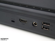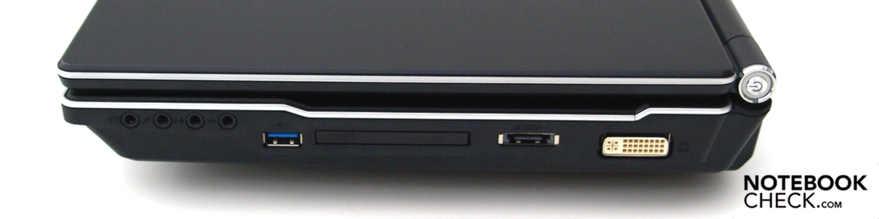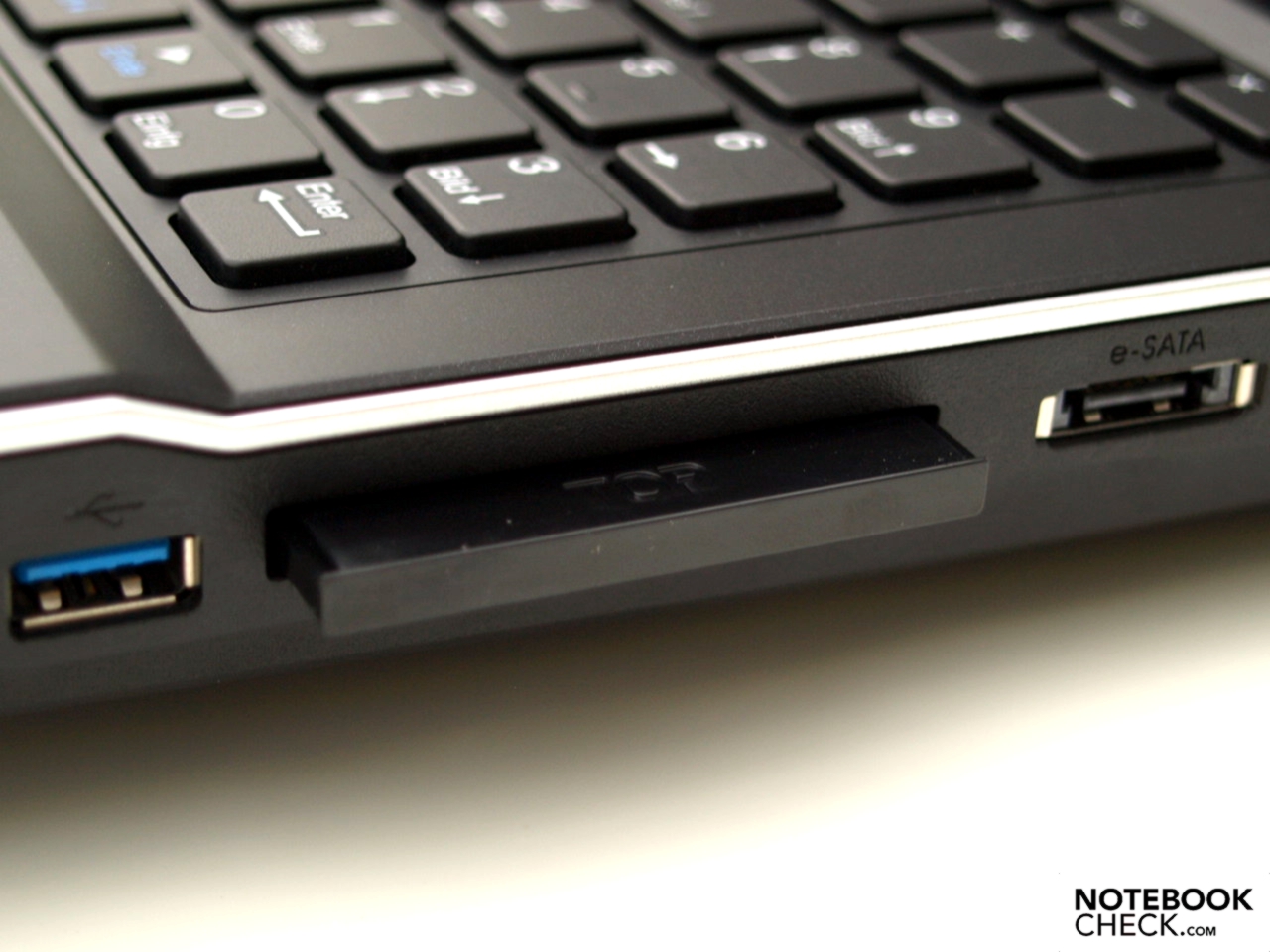 Die Eingabegeräte können überzeugen. Mit an Bord sind sowohl eSATA als auch USB-3.0. Außerdem finden sich digitale Bildschnittstellen wie HDMI und DVI-I direkt am Gehäuse, VGA-Monitore oder Beamer können dagegen via mitgeliefertem Adapter angeschlossen werden. Ebenso muss der Nutzer nicht auf eine FireWire Schnittstelle verzichten. Gleich vier 3.5 mm Audio-Buchsen, ein Kartenleser, eine ExpressCard/54-Slot runden die Schnittstellenausstattung, welche noch dazu benutzerfreundlich angeordnet wurde, ab.
