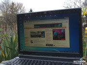 Gute Helligkeit und matte Bildschirmoberfläche sind die Voraussetzung für einen problemlosen Außeneinsatz. In der Tat kann man im Schatten auch draußen seine Freude am XMG P500 Pro haben. Bei direkter Sonneneinstrahlung würde das Display ruhig noch eine Spur mehr Helligkeit vertragen. Störende Reflexionen bleiben dabei jedenfalls aus, nur ein paar diffuse Spiegelungen fallen bei genauerer Betrachtung abhängig vom Blickwinkel auf.