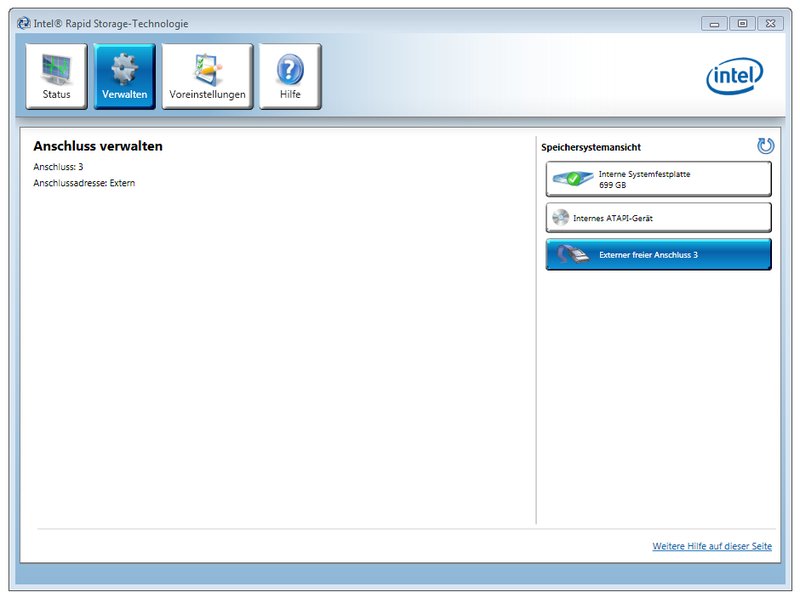 Das Intel Rapid Storage Tool weist für die verbaute Festplatte den Port 0, sprich den von der aktuellen Chipsatz-Problematik nicht betroffenen 6G-Port aus. Unter Umständen betroffen könnten lediglich das optische Laufwerk (Port 2) sowie der eSATA Anschluss an der Gehäuserückseite (Port 3) sein, die beide den 3G Port des Cougar-Point Chipsatzes nutzen. Detaillierte Informationen hierzu finden Sie in diesem Artikel.