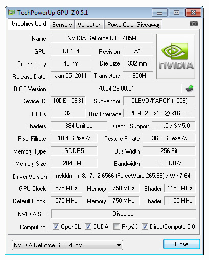 Am Zenit des Machbaren befindet sich die verbaute Grafiklösung. Mit der Nvidia Geforce GTX 485M befindet sich die aktuell wohl leistungsstärkste verfügbare Grafikkarte im Schenker XMG P501. Die Grafikkarte basiert auf den GF104 Chip und unterscheidet sich damit grundlegend von der GTX 480M Grafikkarte, die allerdings eine völlig andere Architektur aufweist. Die GTX 485M bietet 384 CUDA Rechenkerne mit einer Taktfrequenz von 1150 Mhz. Die Videospeicherausstattung beträgt 2GB GDDR5. Weitere Details zur GTX 485M finden Sie entweder in unserem umfangreichen Gaming Test der Nvidia Geforce GTX 485M GPU oder aber auf der Detailseite zum Grafikchip.