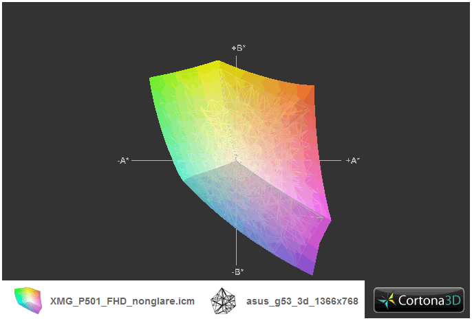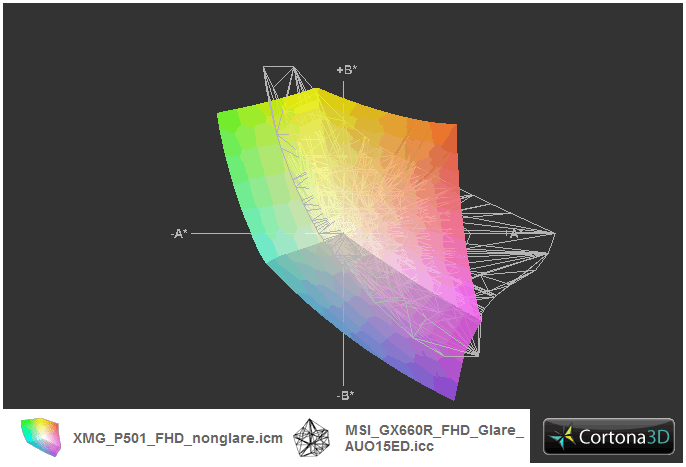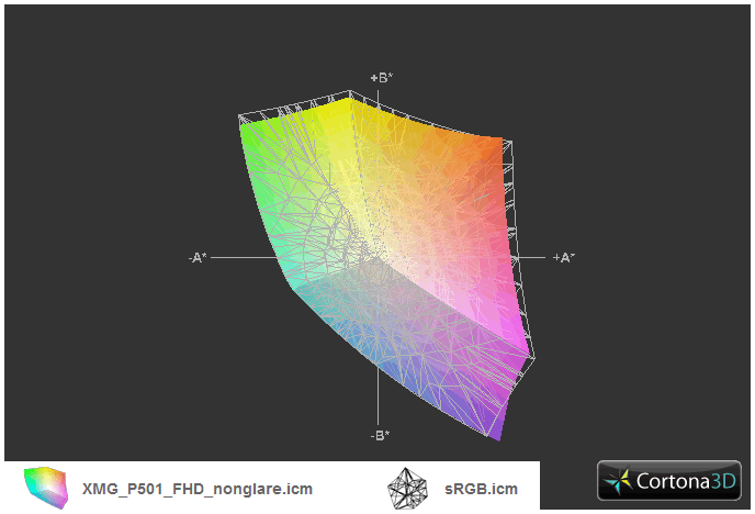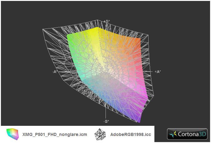 Vergleichsweise positiv fällt auch der darstellbare Farbraum des eingesetzten Panels aus. sRGB kann gut abgedeckt werden, erst der größere Adobe RGB Farbraum geht über die Fähigkeiten des AUO-Displays hinaus. Damit kann auch in diesem Punkt die Masse allen in Notebooks eingesetzten Displays überboten werden. Erst professionelle Laptops mit RGB Display können einen noch größeren darstellbaren Farbraum liefern.