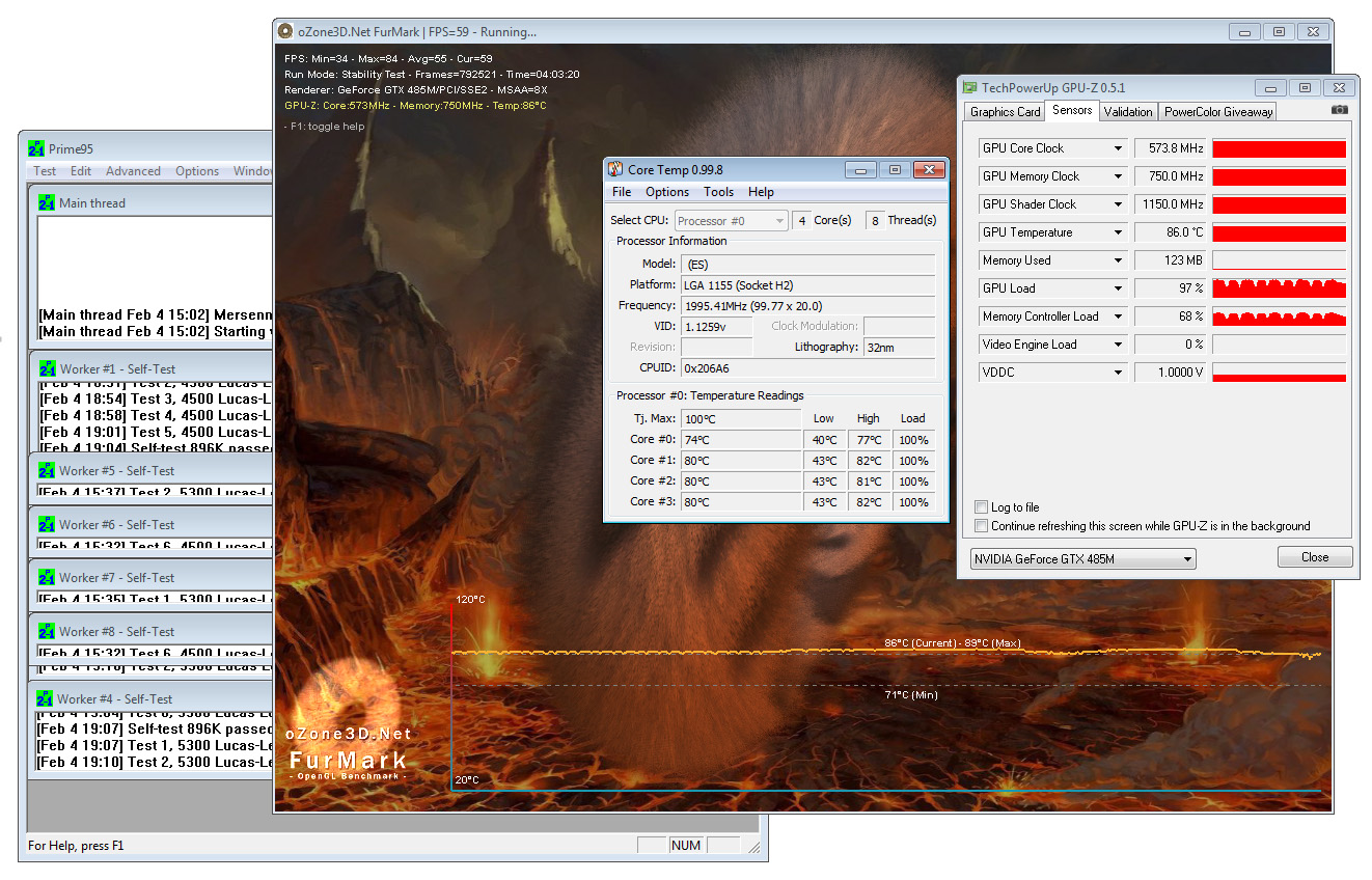 Nach mehr als vier Stunden im Stresstest pendelt sich die CPU bei lediglich 80°C und die GPU bei etwas höheren 86°C ein. Beide Werte geben keinen Anlass zur Kritik. Speziell bei der CPU lässt sich eine durchaus höhere Kühlkapazität ablesen, die etwa erst durch den Einsatz der 2920XM-CPU ausgeschöpft werden kann. Die Taktraten von CPU und GPU bleiben konstant und auch ein direkt im Anschluss an den Stresstest durchgeführter 3DMark Benchmarktest zeigt keine Hinweise auf ein Throttling der verbauten Komponenten.