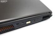 Für einen Gamer der Oberklasse gelten hinsichtlich angebotener Ports etwas verschärfte Anforderungen. So soll umfangreiche Peripherie (Sound, Controller, Speicherlösungen,...) möglichst ohne Beeinträchtigungen angeschlossen werden können. Bereits ein rascher erster Blick um das Gehäuse offenbart hier eine besondere Qualität: die Vorderkante bleibt frei von Anschlüssen, an den Seitenkanten rücken diese soweit nach hinten wie nur möglich und besonders sperrige Kabel und Stecker finden an der Rückseite Platz. Somit ergeben sich sowohl für Rechts- als auch für Linkshänder selbst bei zahlreichen belegten Ports kaum nennenswerte Einschränkungen neben dem Gerät.
