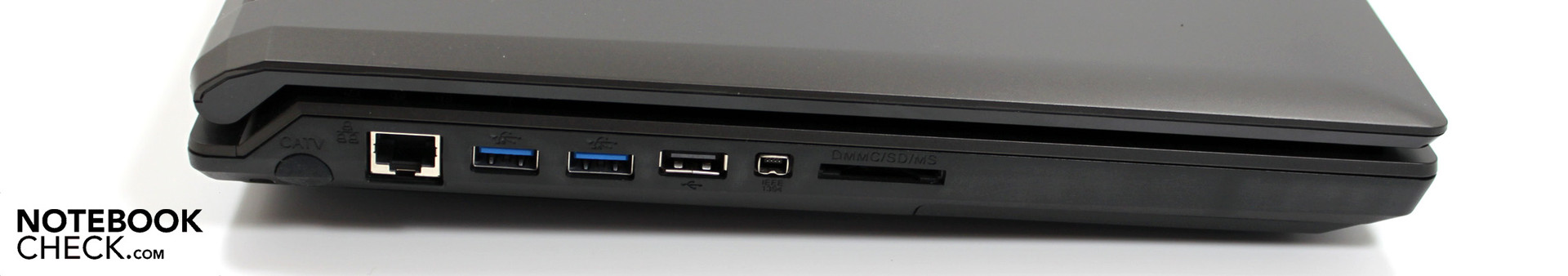 Nicht nur die Position, auch die Anzahl und Art der gebotenen Buchsen stimmt. An der linken Seitenkante finden wir eine Vorkehrung für einen Antennenanschluss (nicht bestückt bei unserem Testgerät), zwei schnelle USB 3.0 Ports, ein USB 2.0 Anschluss, Firewire sowie einen SD-Cardreader.