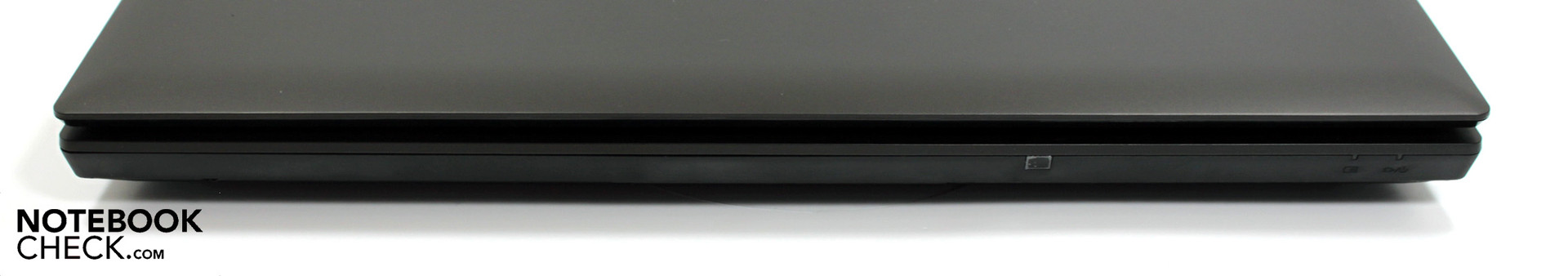 Rechter Hand im vorderen Bereich wurde das optische Laufwerk integriert, gefolgt von den Audio-Ports in Form von mehreren 3.5mm Klinkenbuchsen (Mikrofon, Kopfhörer, LineIn, S/PDIF), einem weiteren USB 2.0 Port und einem Kensington Schloss im Eckbereich.