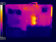 Positiv wäre die Temperaturverteilung hervorzuheben. Zwar erwärmt sich das Chassis eher auf der linken statt der rechten Seite, was für Spieler etwas ungünstig ist, allerdings klettert die Handballenauflage nie über 32 °C. Auf einer festen Unterlage sind längere Tipp- oder Gaming-Sessions also kein Thema.