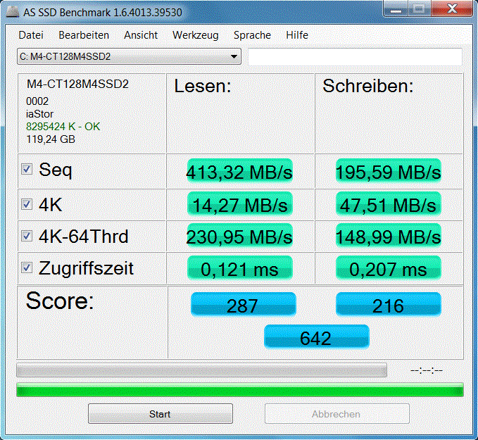 Die von Schenker gewählten Festplatten stehen den übrigen Komponenten in nichts nach. Windows 7 Home Premium war auf einem 128 GByte großen Solid State Drive von Crucial vorinstalliert. Die RealSSD M4 (CT128M4SSD2) ist noch relativ jung und begeistert mit einer tollen Performance. Von einer sequentielle Leserate von 413 MB/Sek und einer sequentiellen Schreibrate von 196 MB/Sek (AS SSD Benchmark) können HDDs nur träumen. Dank SATA III-Schnittstelle wird dem Solid State Drive kein Riegel vorgeschoben, die älteren SATA II-Modelle waren auf 300 MB/Sek begrenzt. Die Zugriffszeit ist mit 0.1 ms (Lesen) respektive 0.2 ms (Schreiben) ebenfalls hervorragend.