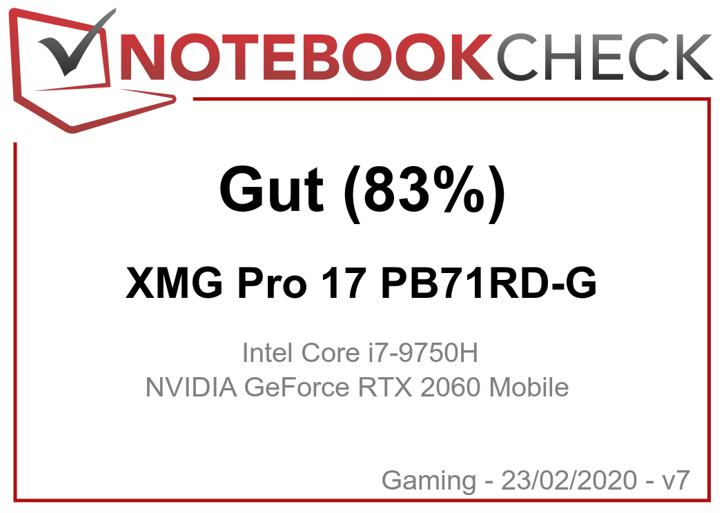 | 83.2 % v7 (old) | 02 / 2020 | Schenker XMG Pro 17 PB71RD-G i7-9750H, GeForce RTX 2060 Mobile | 2.8 kg | 30 mm | 17.30" | 1920x1080 | |