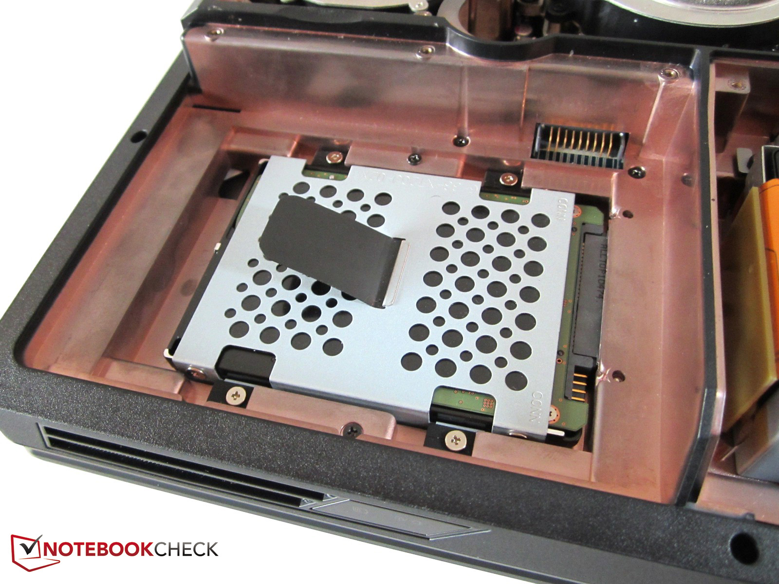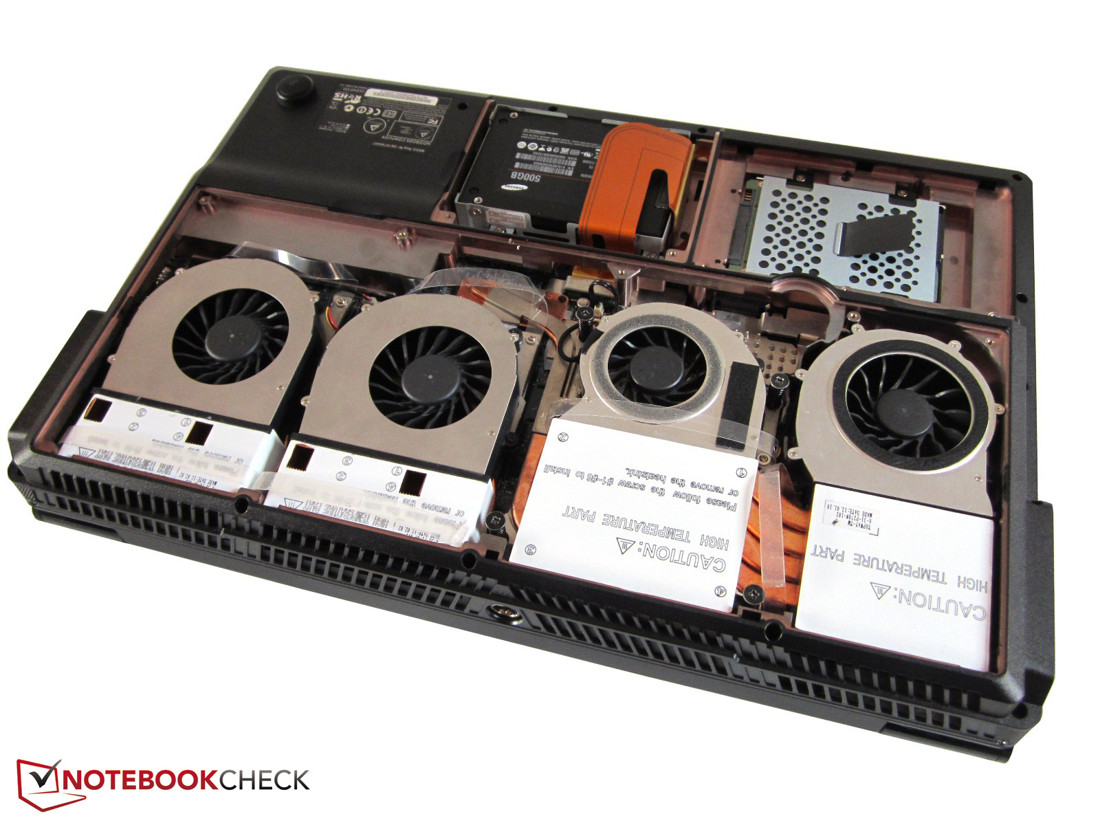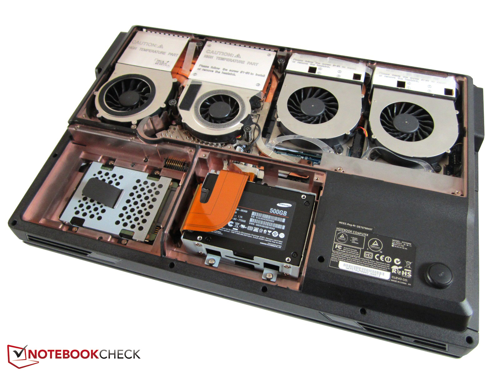 Clevo typisch bietet das Notebook sehr viele Upgrade- und Wartungsmöglichkeiten. Nach dem Entfernen des Akkus und der Bodenplatten liegt das gesamte Innenleben frei. Die vier Lüfter, welche Grafikkarte, Prozessor und Arbeitsspeicher bedecken, sind allesamt abschraubbar. Während sich unter der kleineren Wartungsklappe ein Festplattenkäfig mit zwei SATA-III-Steckplätzen tummelt, verbirgt der Akku den dritten HDD- bzw. SSD-Schacht.