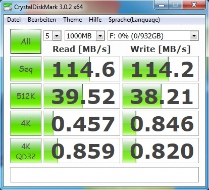 Noch ein paar Worte zur integrierten HDD: Bei der Seagate Momentus ST1000LM024 handelt es sich um ein 9,5 Millimeter hohes SATA-II-Drive, das trotz der recht niedrigen Drehzahl (5400 U/Min) eine verhältnismäßig gute Leistung bietet. Dank einer sequentiellen Lese- und Schreibrate von knapp 114 MB/Sek gewinnt die HDD etwa 10 % gegen den Terabyte-Konkurrenten Toshiba MQ01ABD100 (~104 MB/Sek @ Nexoc M507II).