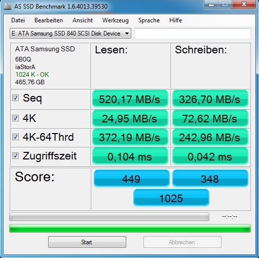 Über mangelnden Speicherplatz konnten wir uns nun wirklich nicht beklagen: Schenker verpasste dem Testgerät zwei 500 GByte große SSDs und eine 1000 GByte große HDD. Um dem High-End-Anspruch Rechnung zu tragen, kam als Solid State Drive die vielversprechende Samsung 840 MZ-7TD500 zum Einsatz, welche das Erbe der beliebten 830er-Reihe antritt.
