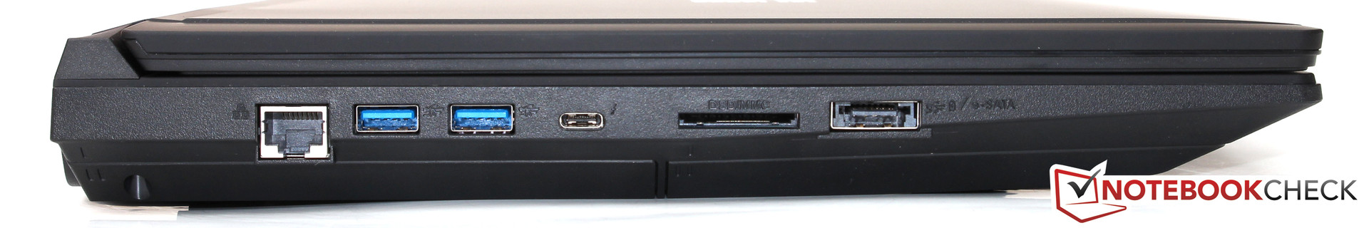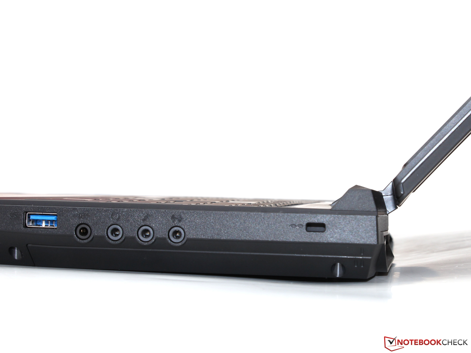 Das mächtige, fast 4 Kilogramm schwere und 3,9 Zentimeter hohe Clevo Barebone unterscheidet sich nicht nur auf den ersten Blick kaum von seinem Haswell Pendant (siehe Testbericht One K73-5N). Neu und erwähnenswert ist lediglich der moderne USB-3.1-/Thunderbolt-3-Anschluss (Typ-C-Stecker) an der linken Gehäuseseite, für den allerdings eine der zuvor noch fünf USB-3.0-Buchsen gestrichen wurde. Ansonsten bleibt alles beim Alten, was in diesem Fall aber keineswegs als Kritik zu verstehen ist: Highlights wie gleich zwei DisplayPort-1.2- sowie einen HDMI-2.0-Ausgang oder eine optische S/PDIF-Schnittstelle trifft man selbst in dieser Klasse nicht überall an.