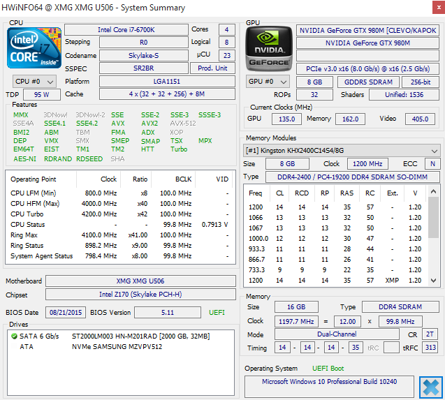 | Schenker XMG U706 GeForce GTX 980M, 6700K, Samsung SM951 MZVPV512HDGL m.2 PCI-e | Asus G751JY GeForce GTX 980M, 4720HQ, Samsung SSD XP941 MZHPU256HCGL | MSI GT72-2QE16SR21BW GeForce GTX 980M, 5700HQ, 2x Toshiba HG6 THNSNJ128G8NU (RAID 0) | Alienware 17 R2 GeForce GTX 980M, 4980HQ, Lite-On IT L8T-256L9G | Schenker XMG U705 GeForce GTX 970M, 4790, Samsung SM951 MZHPV256HDGL m.2 PCI-e | |