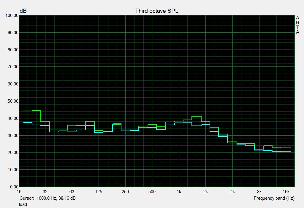 | Idle avg * (dB) | 35 | 34 3% | 30.8 12% | 31 11% | 33 6% |
