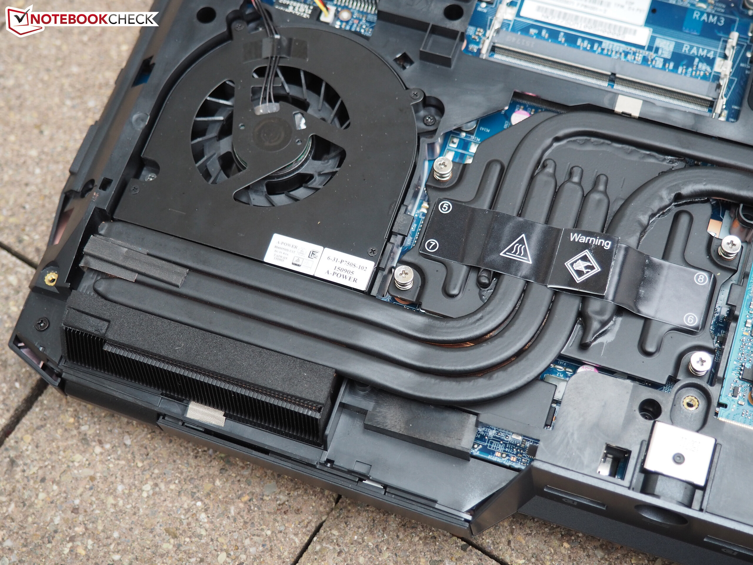 Durch den Desktop-Sockel 1151 und den MXM-3.0-Steckplatz können Prozessor und Grafikkarte auf Wunsch ausgetauscht werden, was bei Notebooks sehr ungewöhnlich ist. Allerdings muss für einen Wechsel der komplette Kühlkörper abgeschraubt werden, da sich zwei der insgesamt sieben Heatpipes über beide Komponenten schlängeln. Schön finden wir hingegen die Tatsache, dass der Akku nicht mit dem Mainboard verbunden ist, sondern direkt von außen ein- bzw. ausgesteckt wird.