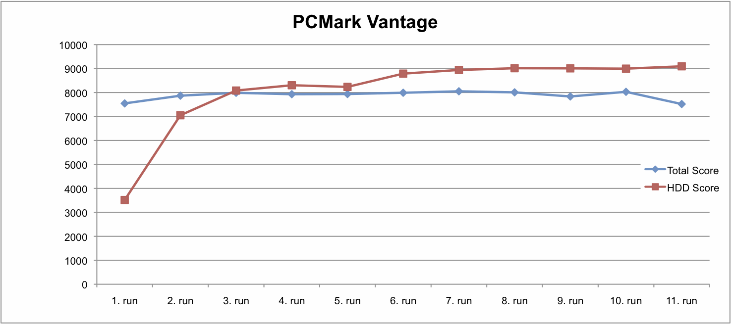 Der PCMark Vantage misst die Systemleistung aller beteiligten Komponenten. Für unsere Benchmarks betrachten wir besonders den Gesamtscore und den HDD Einzelwert. Beim ersten Durchlauf erzielt die Seagate XT einen HDD Wert welcher für 2.5" HDDs typisch ist. Bereits beim zweiten Druchlauf verdoppelt sich die HDD Bewertung und der SSD Speicher der Seagate XT zeigt seine Wirkung. Die Gesamtpunktezahl steigert sich auch beim ersten Durchlauf merkbar und bleibt dann auf diesem Niveau. Der HDD Wert steigt jedoch bis zum 11. Durchlauf leicht an.