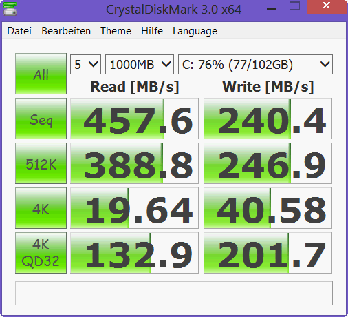 Die Toshiba SSD (THNSNS128GMCP, 128 GB, mSATA) ist am 6-GB/s-SATA-Port angebunden und schaufelt vermeintlich enorme Datenmengen über die Sektoren. Mit den gängigen SSDs kann der Read-Wert von knapp 500 MB/s bestens mithalten. Dies sorgt nicht nur für ein blitzschnelles Hochfahren (auch bei Kaltstart), sondern auch für schnelle Kopier- oder Ladevorgänge.