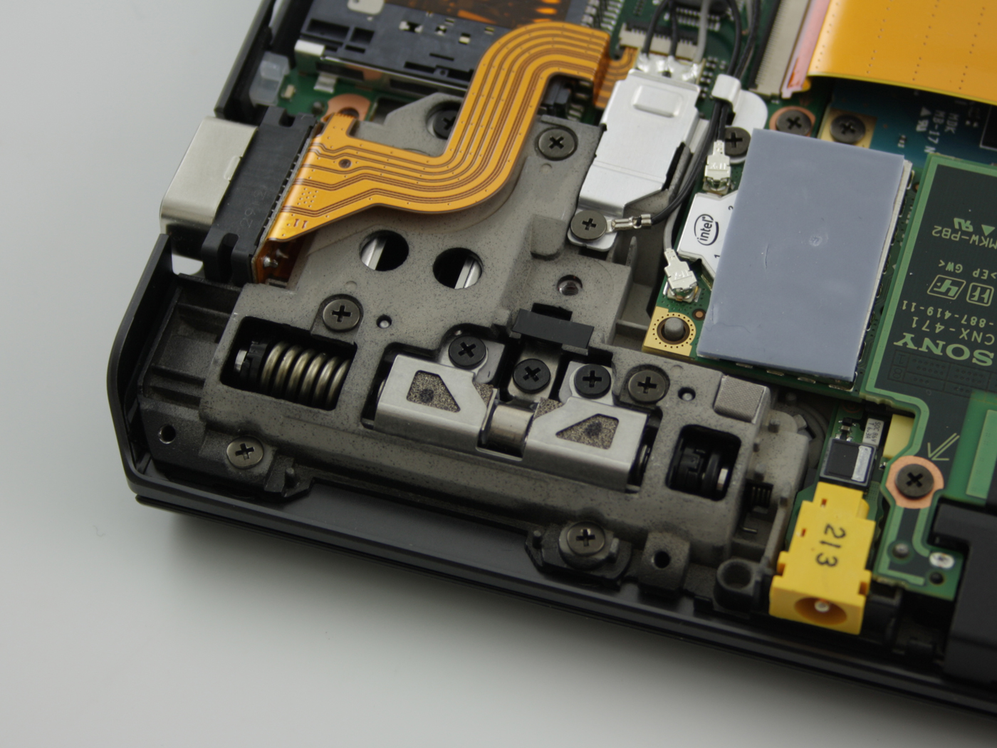 Sony entschied sich für den Slider-Mechanismus, wie ihn erstmals das Asus Eee Pad Slider SL101 (Ende 2011) auf den Markt brachte. Das Gehäuse fällt deshalb insgesamt dicker aus, ist mit 18 mm aber alles andere als wuchtig. Die Vorteile: Der Vaio trägt normale Schnittstellen, so etwa einen Full-Size D-Sub VGA-Port und einen Ethernet RJ45 auf der Rückseite. Die Füße sind bei der Höhenangabe nicht einbezogen, sie bringen den Vaio drei bis sechs Millimeter (ausgeklappte hintere Standfüße) nach oben. Auf diese Weise ergibt sich ein Freiraum vor dem Luftauslass (Rückseite).