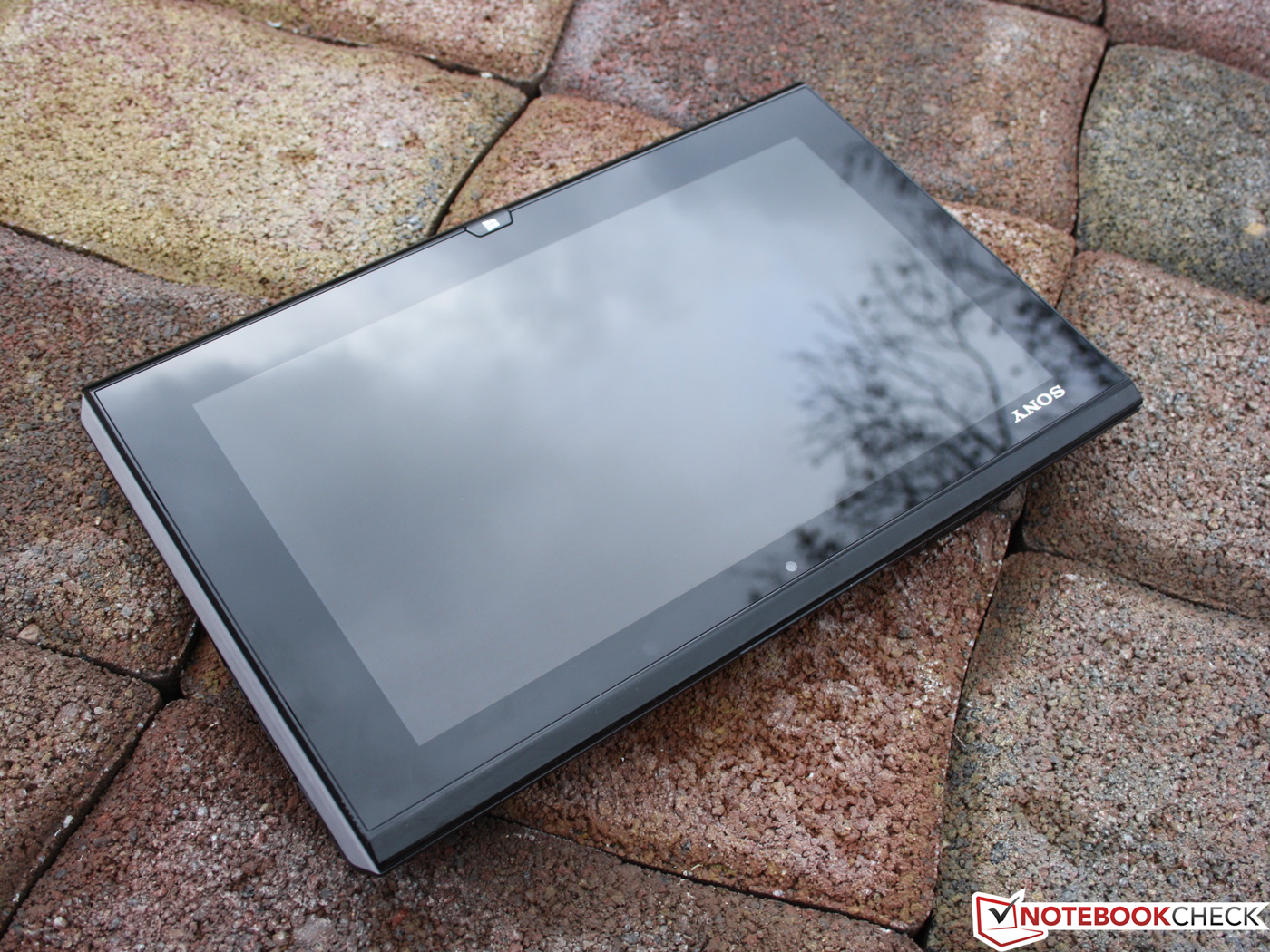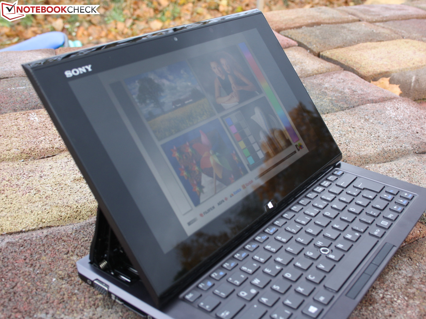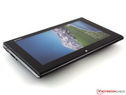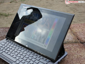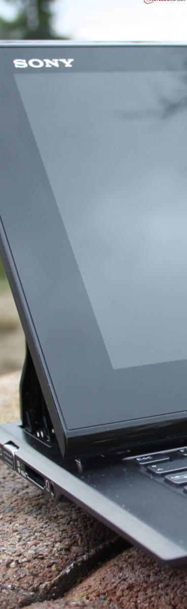 Im Tablet-Modus ist das Panel neben dem Gelenk an vier Haken mit der Base Unit verbunden. Weil selbige einen halben Zentimeter breiter ist als das TFT, hat der Nutzer beim Hantieren den Eindruck eines Slate-PCs, der aus einem Stück besteht. Die Fläche des Touch Panels orientiert sich an der Festigkeit guter Tablets und gibt auf Druck kaum nach. Wir meinen, Sony ist eine exzellente Konstruktion gelungen, denn im Tablet-Einsatz offenbart sich dem Nutzer nicht zwangsläufig der zweiteilige Aspekt des Duo 11.