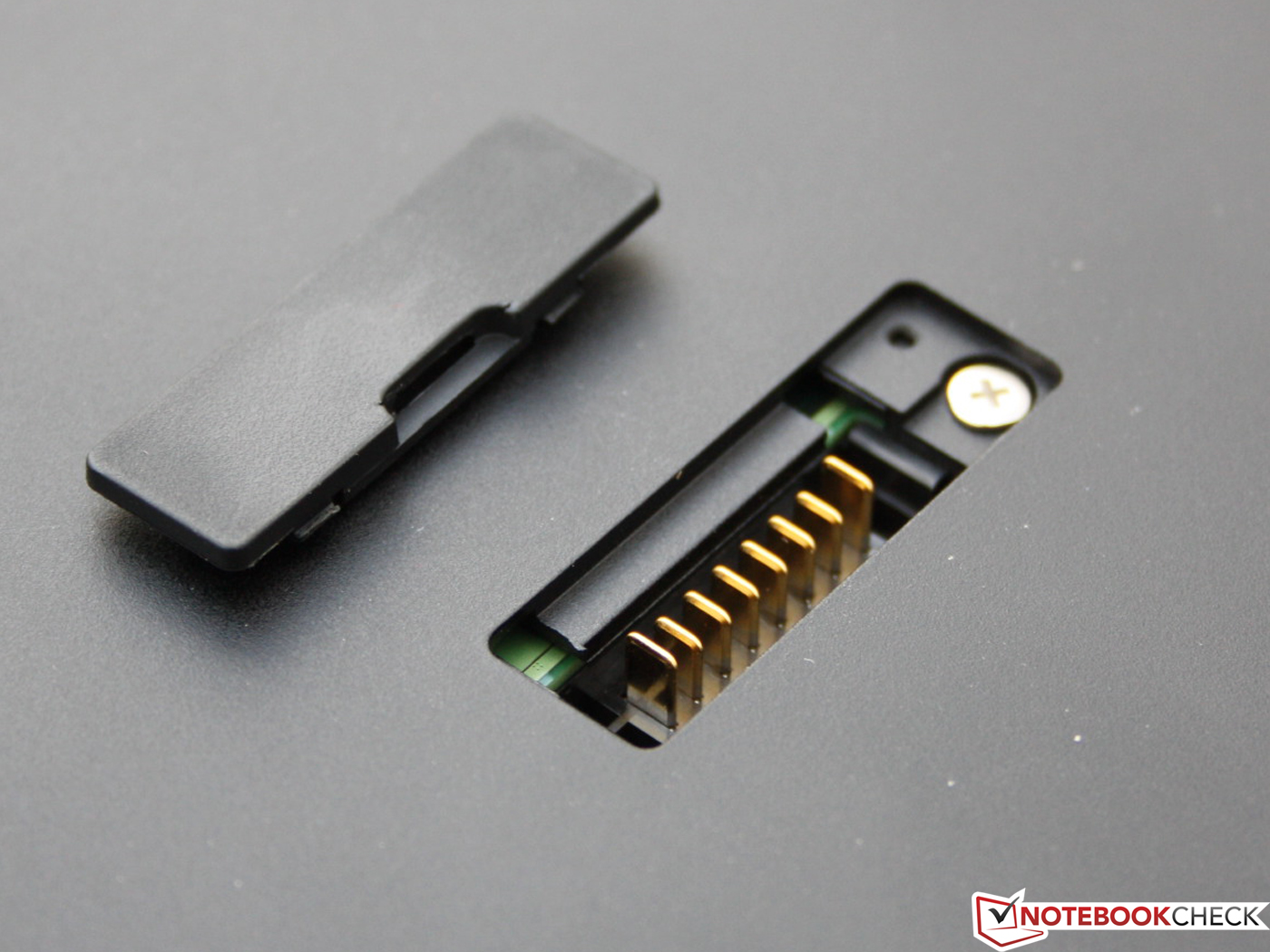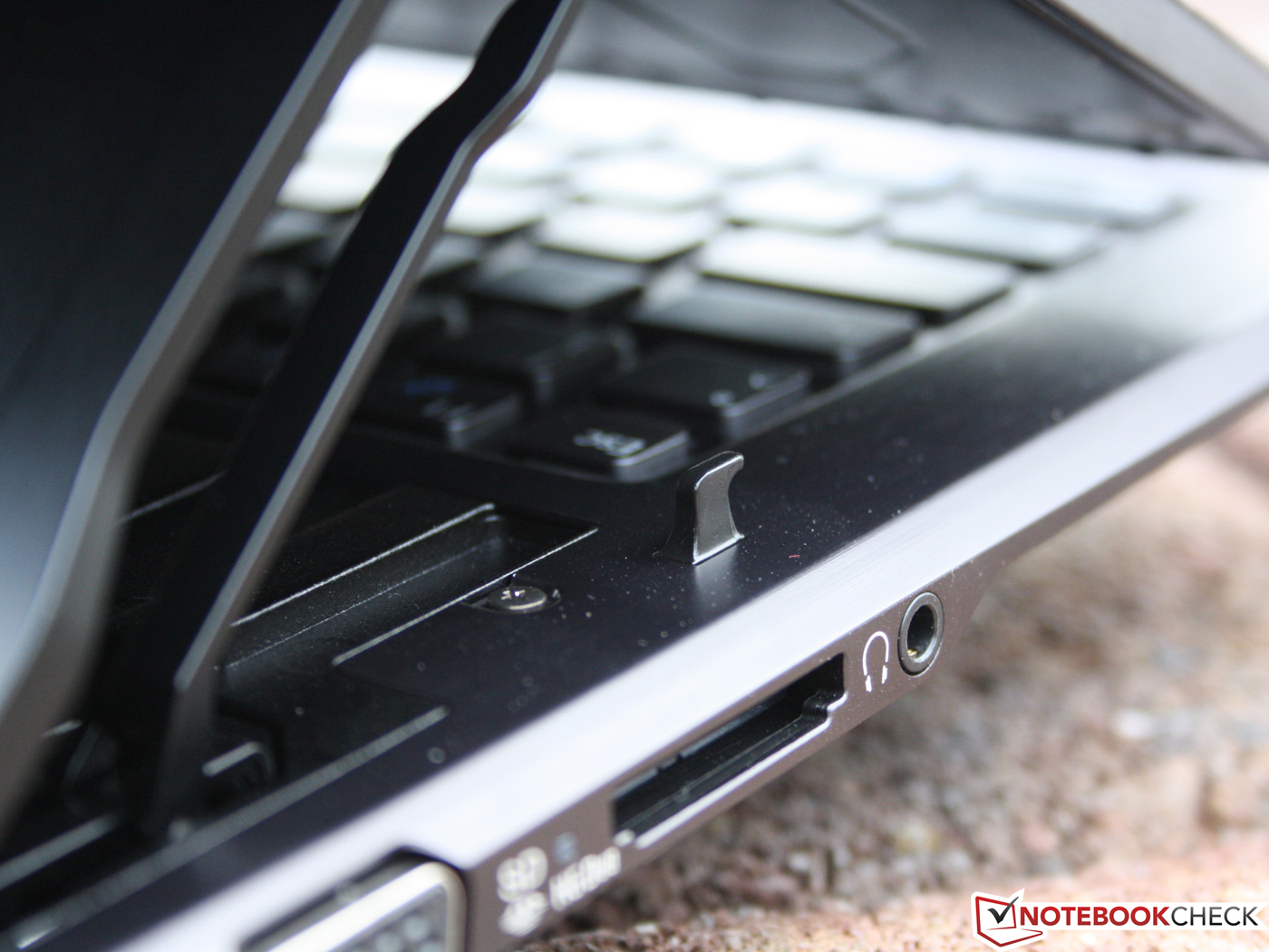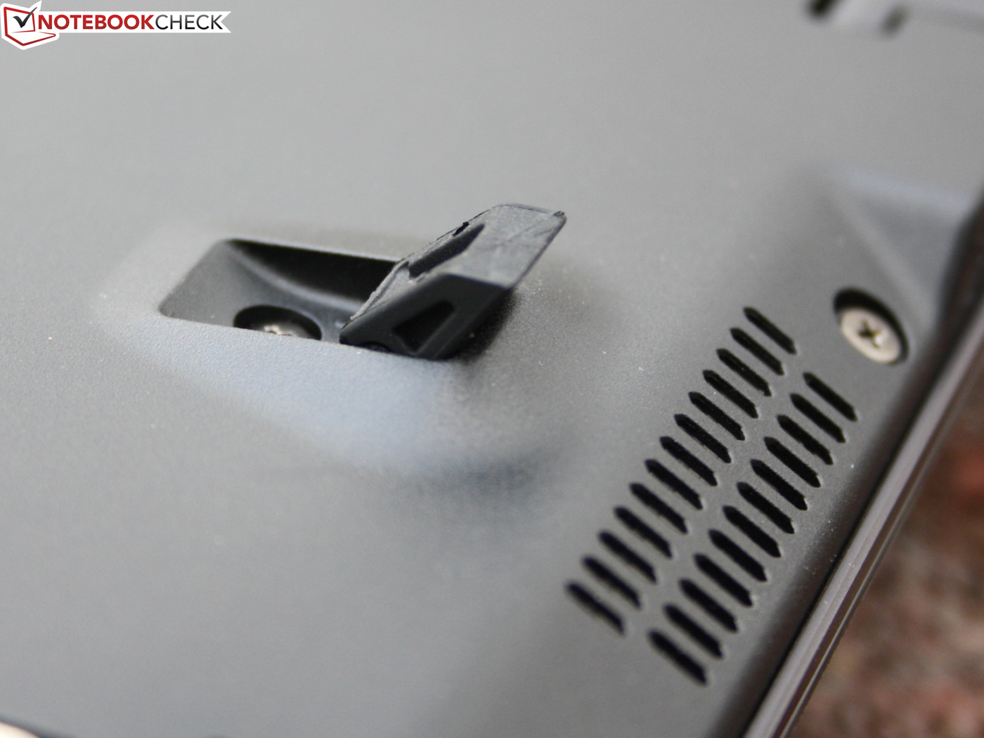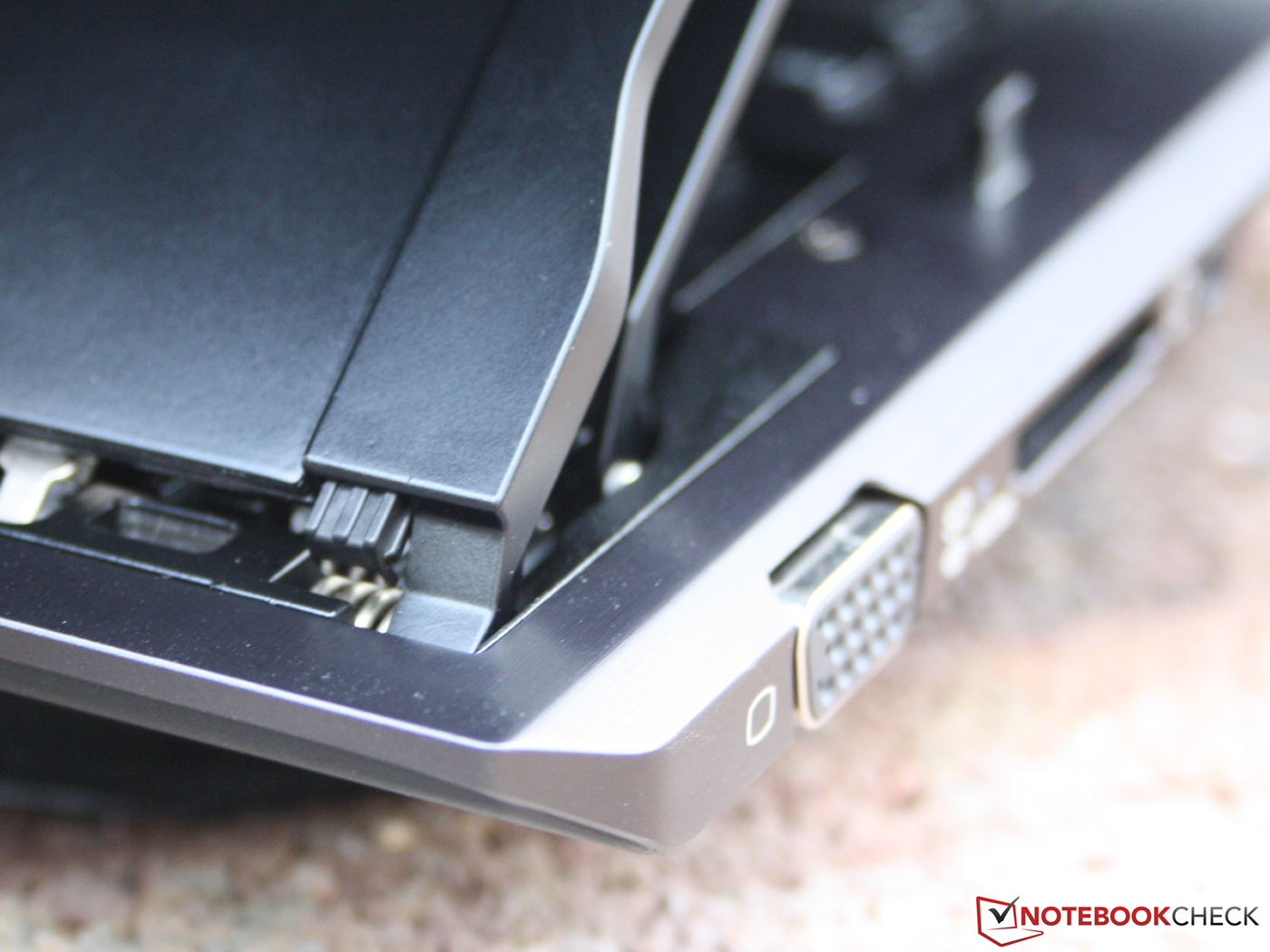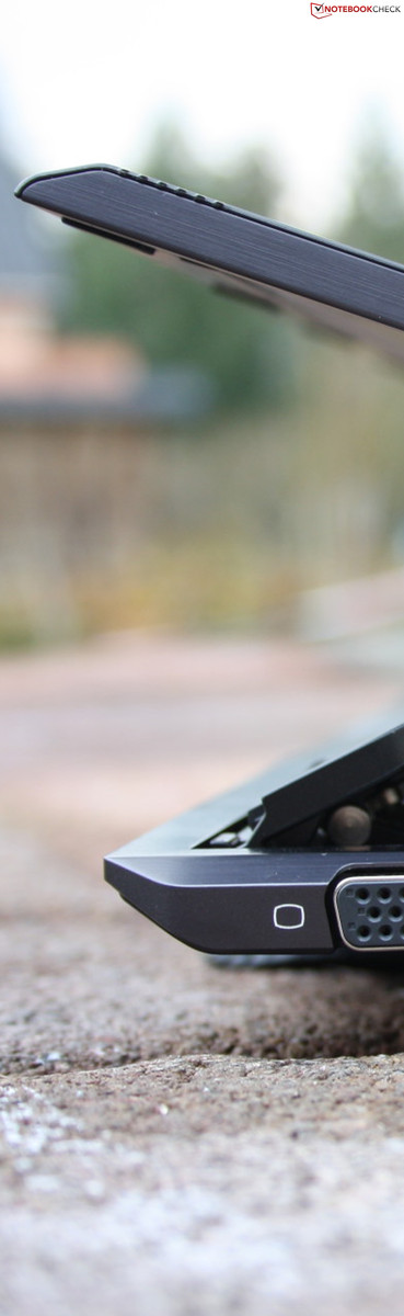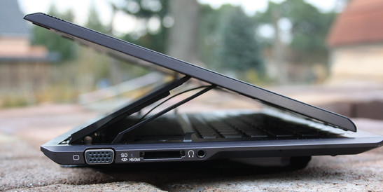 Das Gelenk besteht aus massiven Magnesiumbauteilen. Der große Arm, zu dem auch die Rückwand gehört, hält das Panel in Position. Die kleine Stütze davor sorgt für die korrekte Neigung. Zwei Metallhaken (Base Unit) rasten in der Endposition in das TFT ein. Das Öffnen und Schließen kommt ohne Kraftanstrengung aus: Deckel rückseitig nach oben ziehen und nach wenigen Zentimetern (Totpunkt) schiebt sich das Gelenk durch Federkraft in die Endposition. Was der Käufer nicht erwarten kann, ist die Massivität eines Alu-Unibody. Bedingt durch das Gelenk wackelt das Panel in seiner Position, es schwingt aber nicht und gibt bei Druck durch die Hände nicht nach.