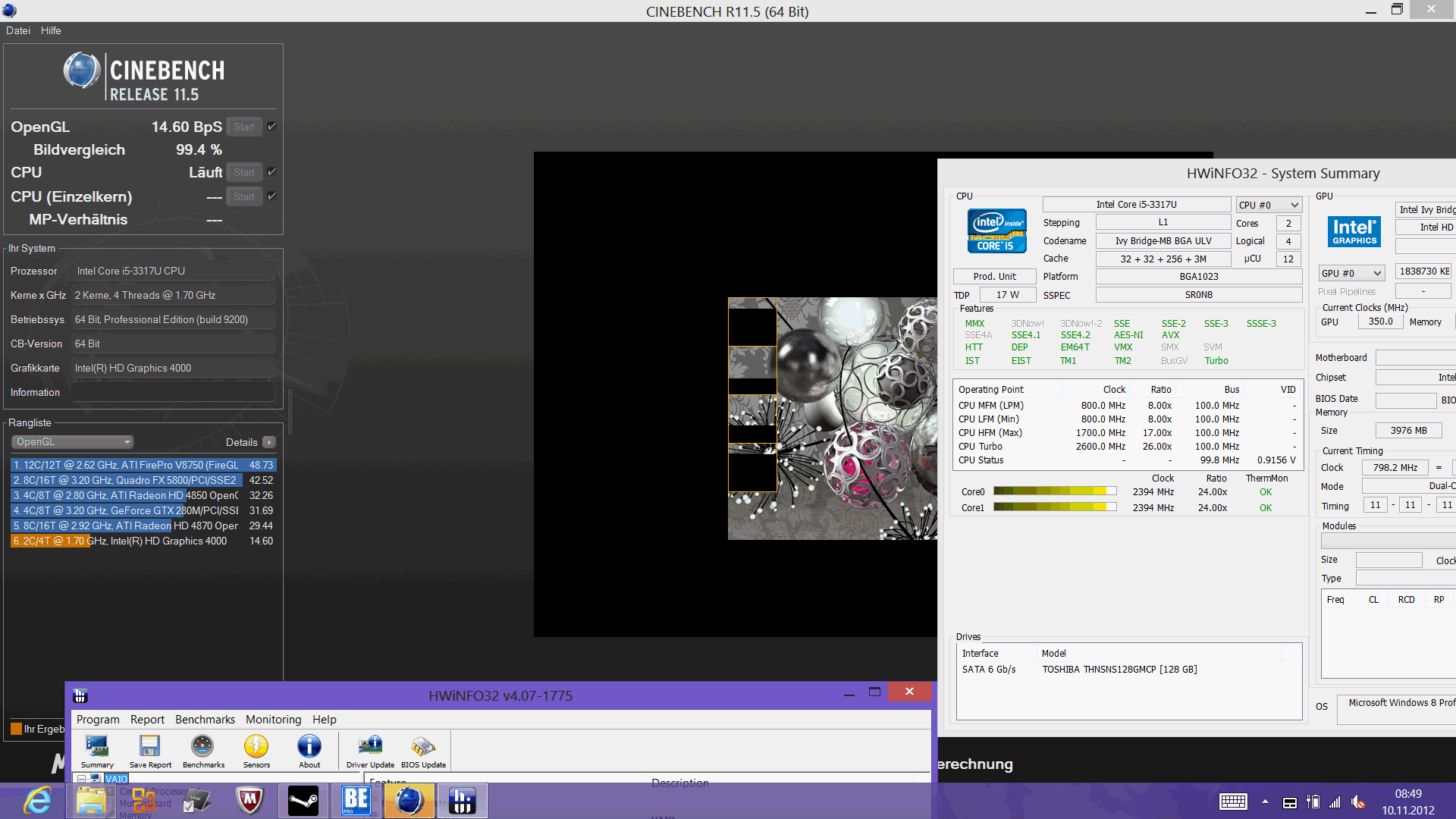 Der Cinebench R11.5 CPU Multi Test fällt identisch zum Asus Zenbook Prime UX31A aus. Die Kühlung der flachen Base Unit schafft es, die Temperaturlimits für den Turbo aufrecht zu erhalten. 2,4-GHz-Taktung liegt deutlich im Turbo-Bereich (Standard 1,7 GHz). Gleiches im R11.5 Single Test (1,07 Punkte). Hier liegen sämtliche Ultrabooks mit gleicher GPU bei 1,04 bis 1,07 Punkten. Im Akkubetrieb muss der Nutzer im Übrigen NICHT auf Leistung verzichten. OpenGL- und Multi-Test enden identisch zum Netzbetrieb.
