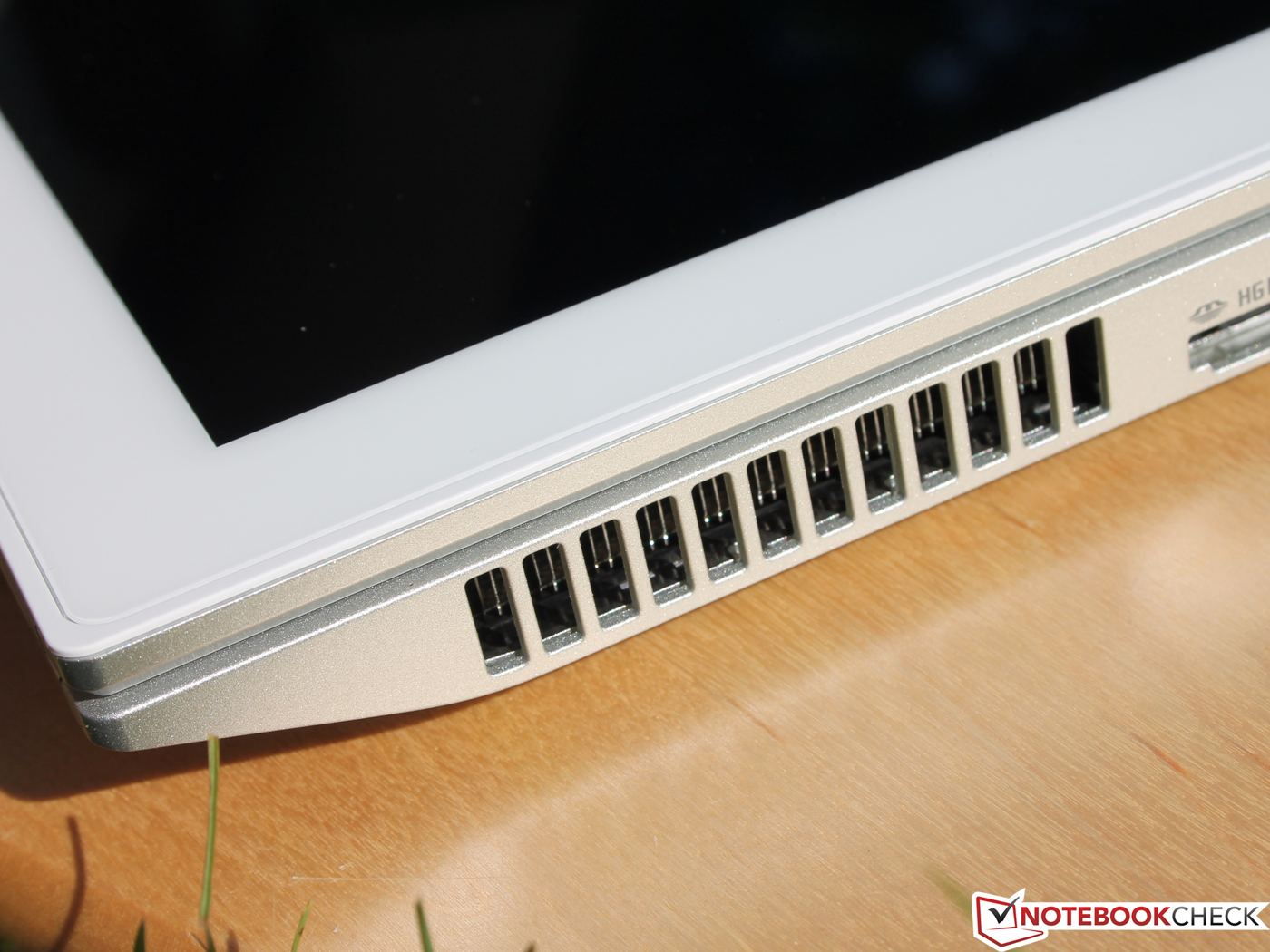 Das Chassis besteht aus Ober- und Unterschale, jeweils aus lackiertem Magnesium. Die matten Flächen sind haptisch nicht so kühl, wie es bei Aluminium der Fall gewesen wäre, aber leichter als das Metall. Die Base-Unit, welche das komplette technische Innenleben des 13-Zollers beherbergt, ist ausreichend verwindungsfest. Mit geringer Kraft können Hände die Konstruktion aber deutlich verbiegen, vor allem die Unterseite biegt sich und offenbart kleine Hohlräume. Dies bezieht sich auf den Tastatur-Bereich. Die hintere Partie (mit den Komponenten und Anschlüssen) ist solider gebaut.